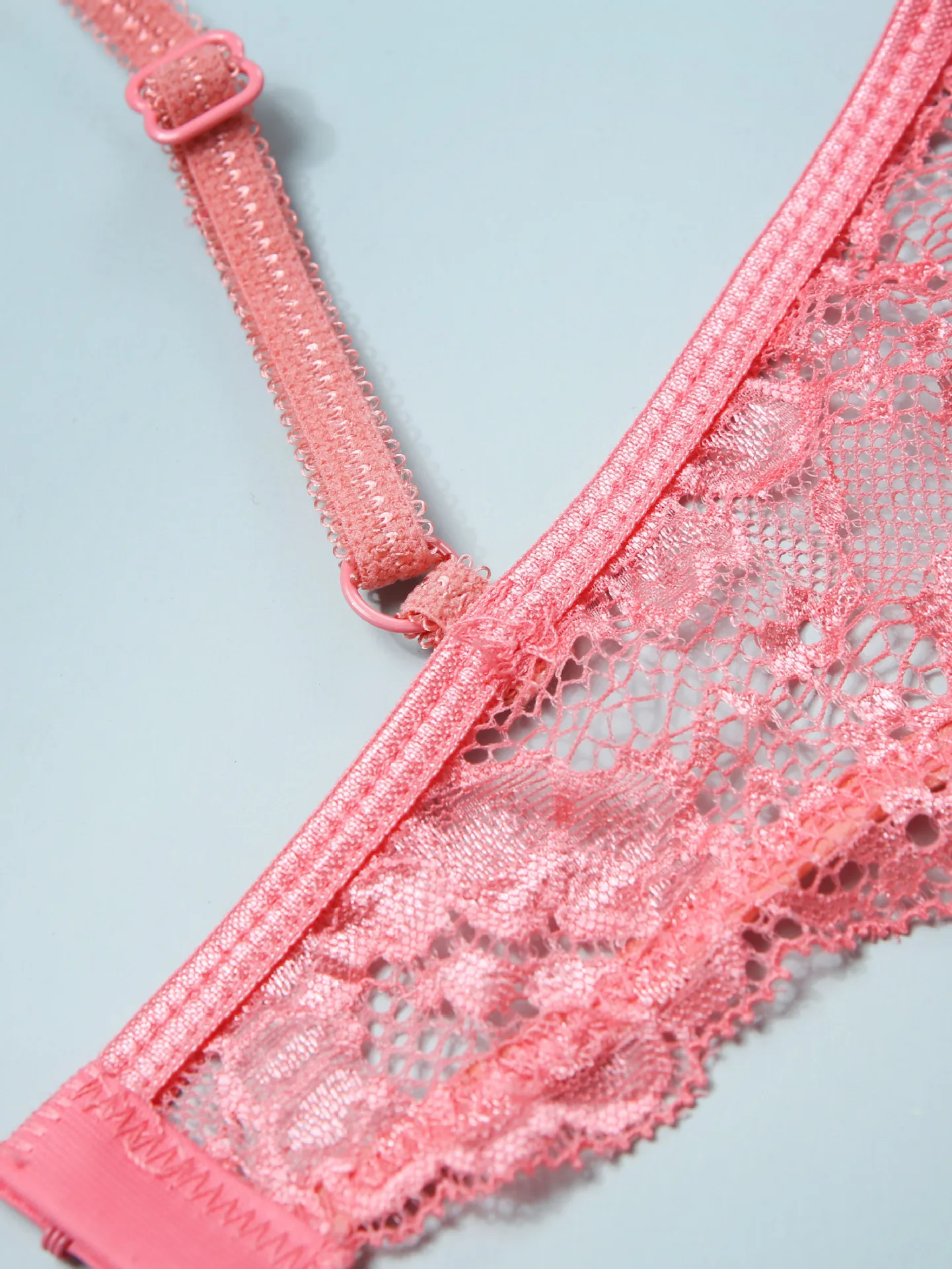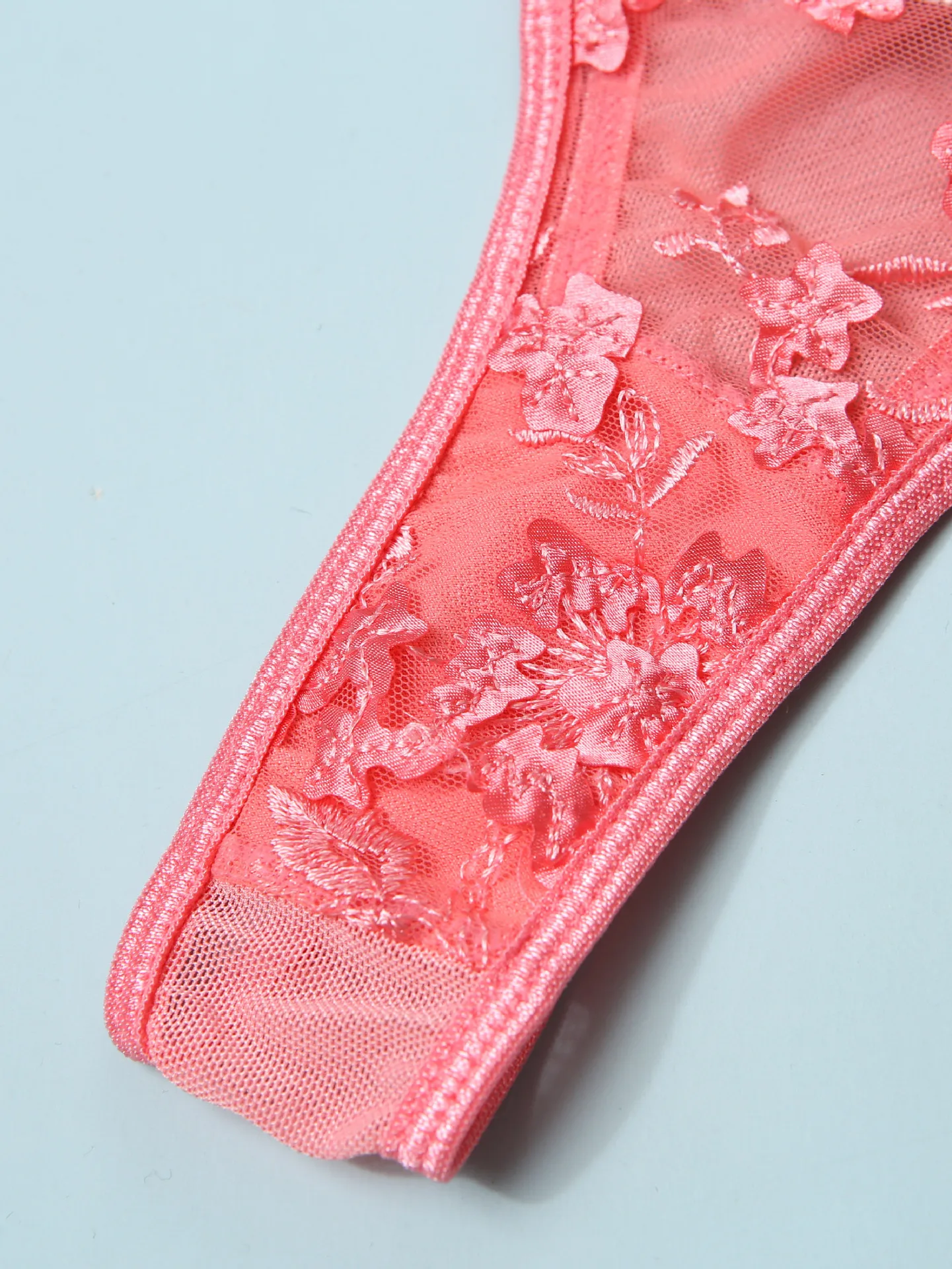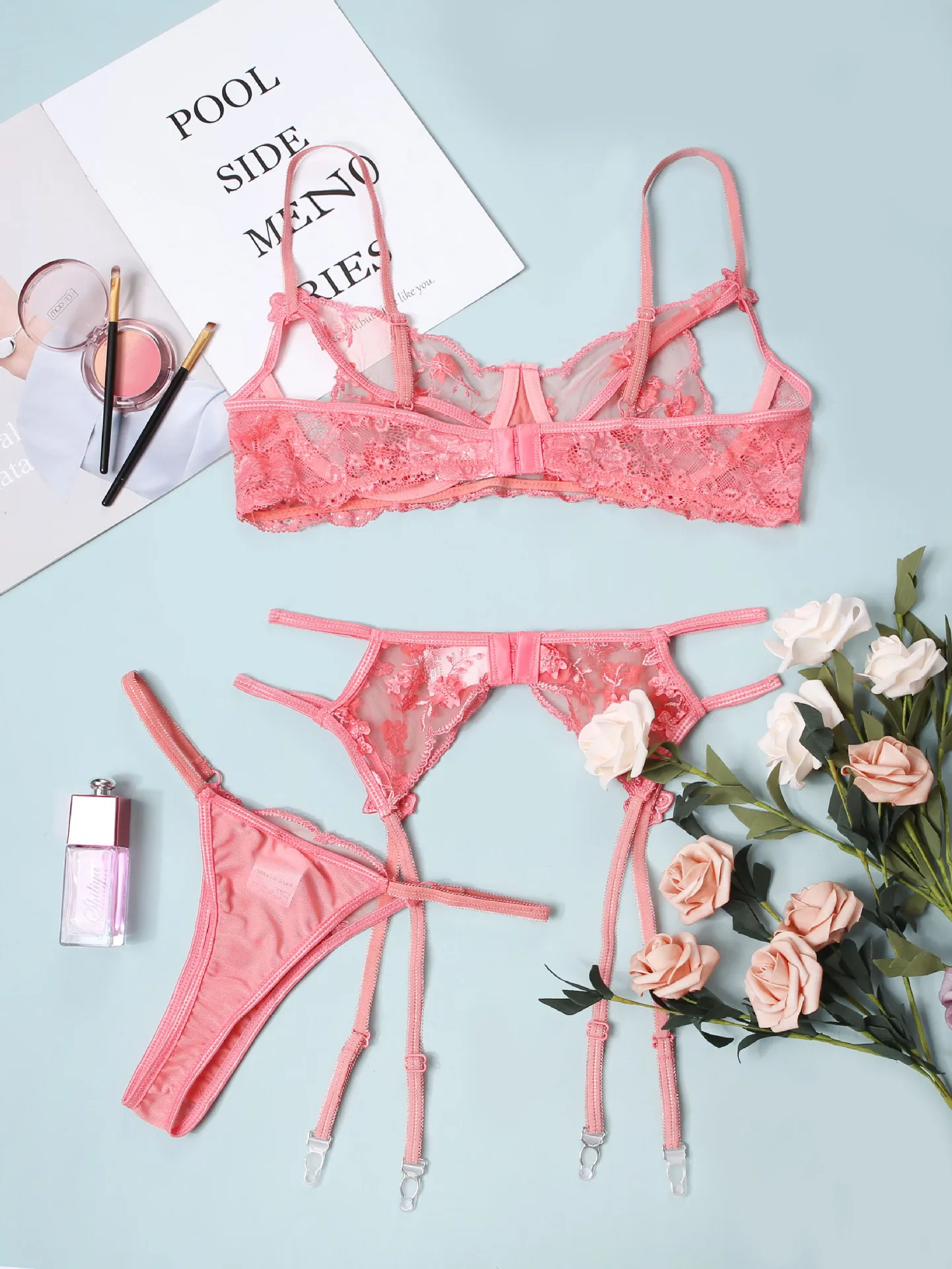 3 Pieces Set Sensual Lingerie Transparent Lace Transparent Underwear Floral Embroidery Underwire Bra and Thong Set with Garters