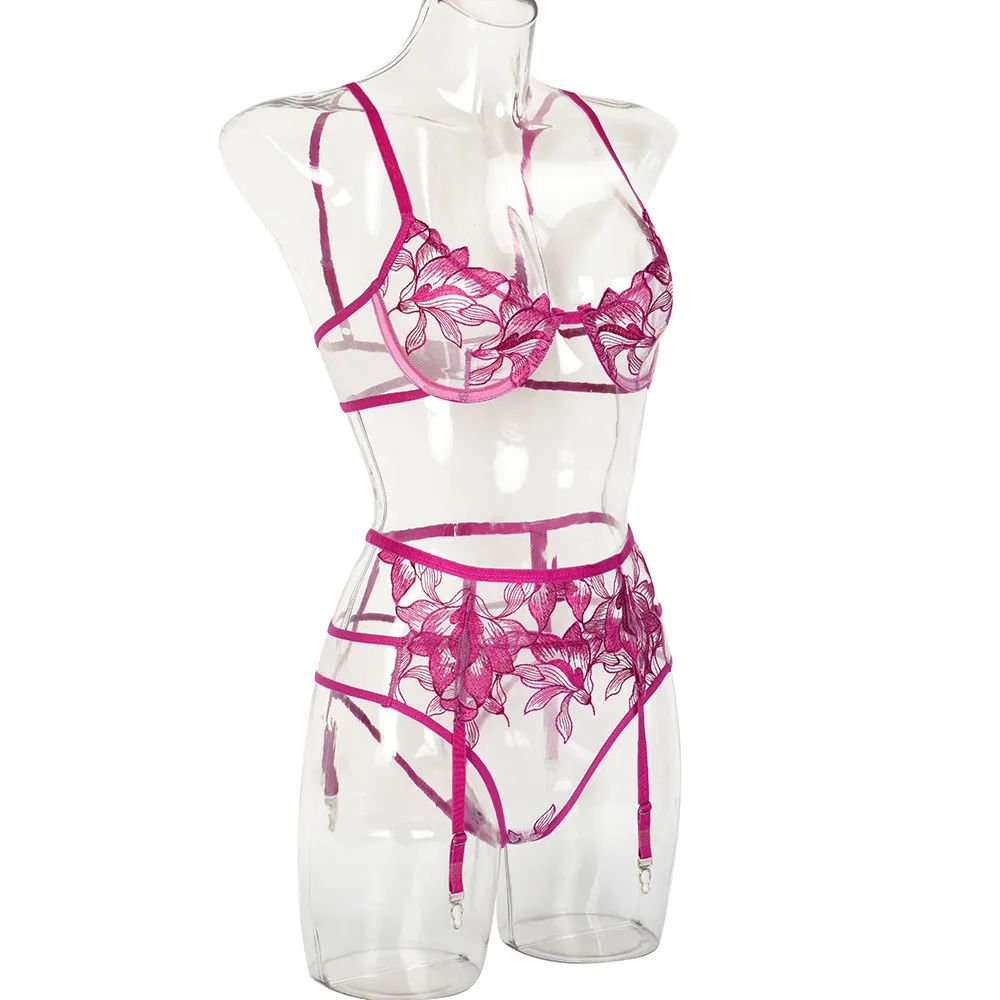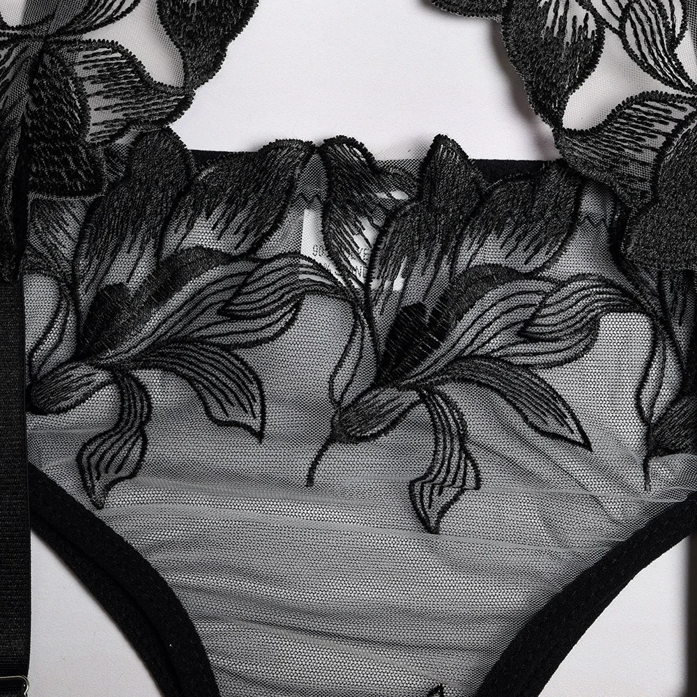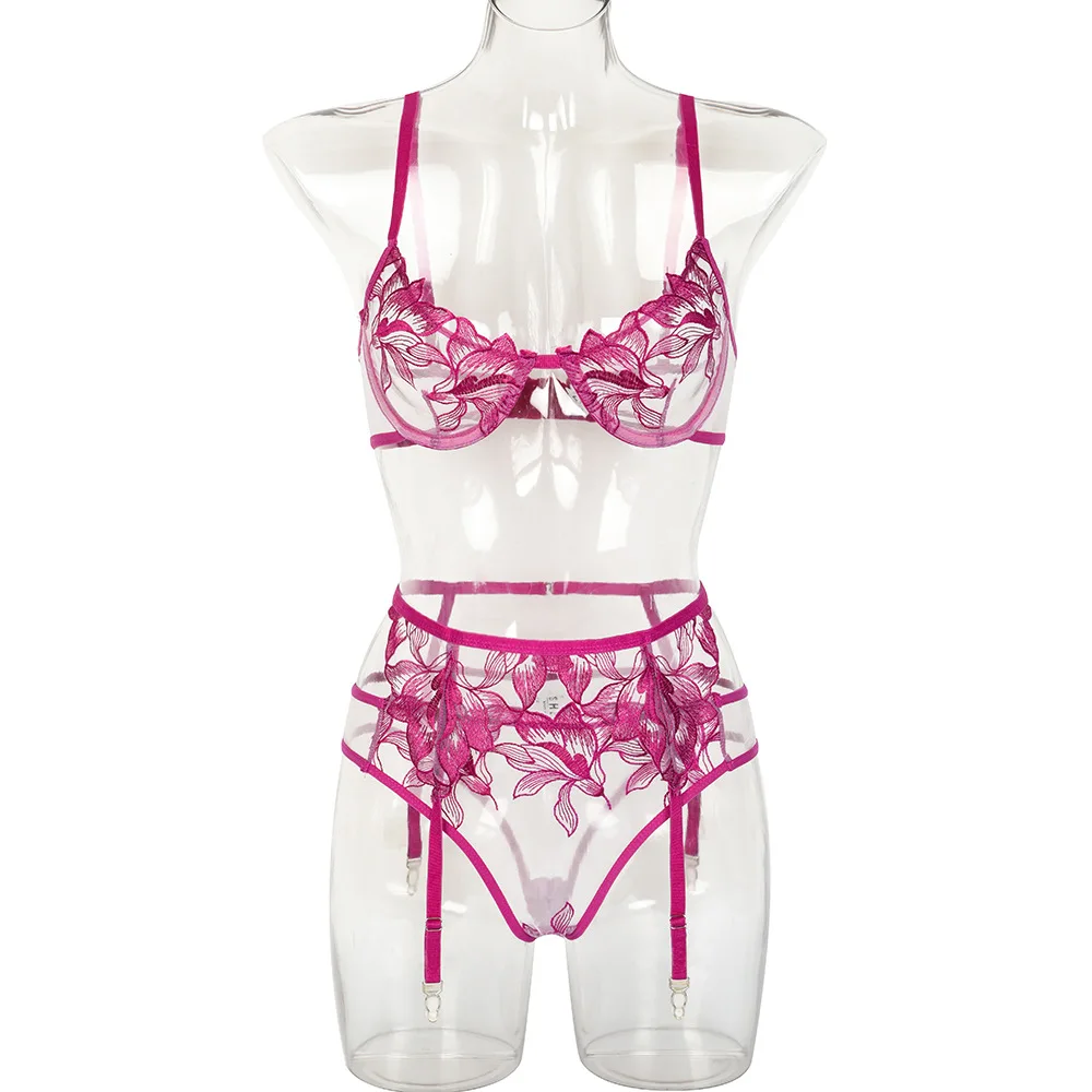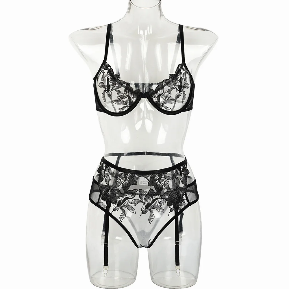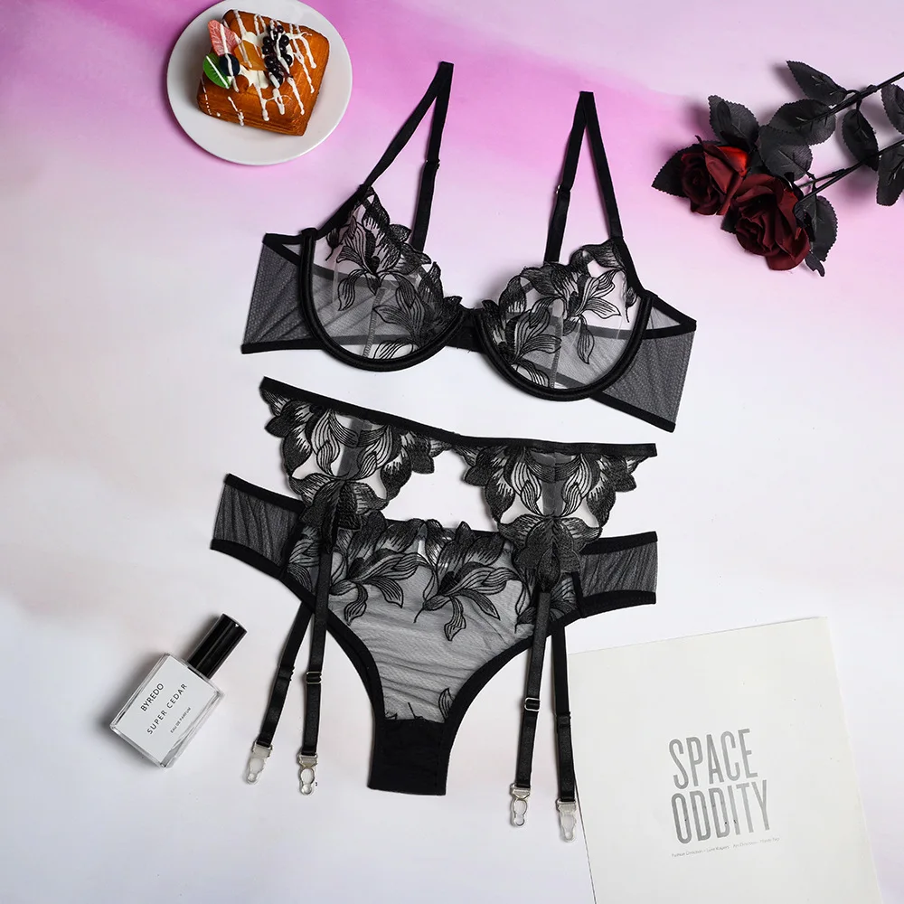 3 Pieces Set Women Sexy Embroidery Sensual Lingerie Underwear Lace Erotic Bra Garters and Brief Set Perspective Exotic Underwear