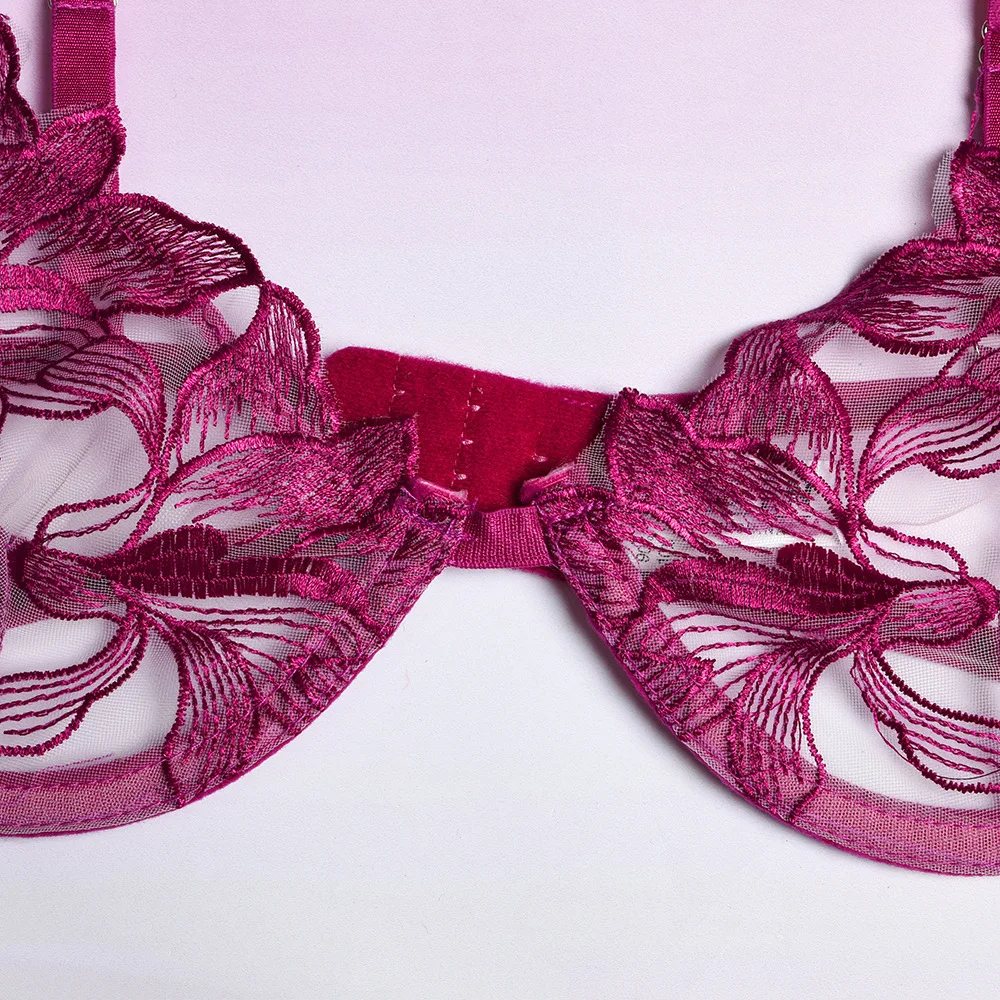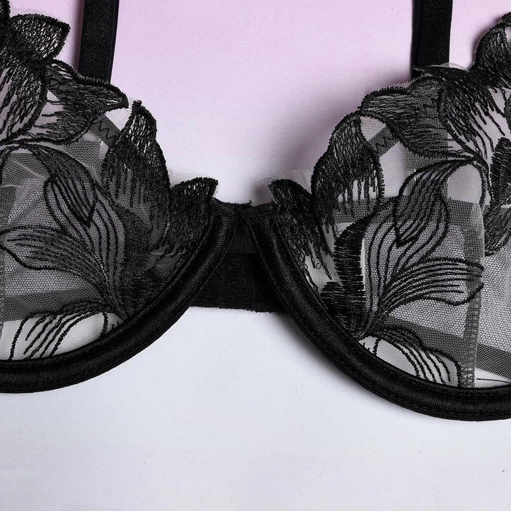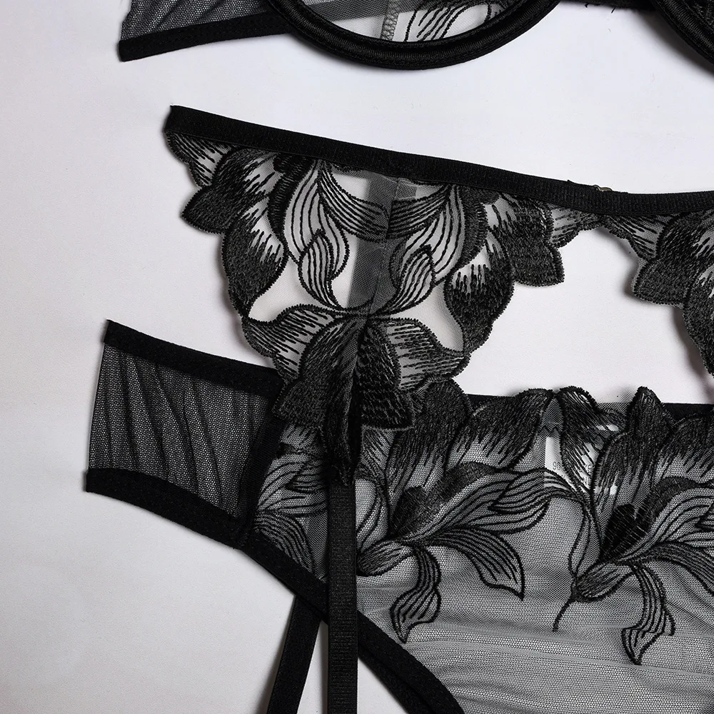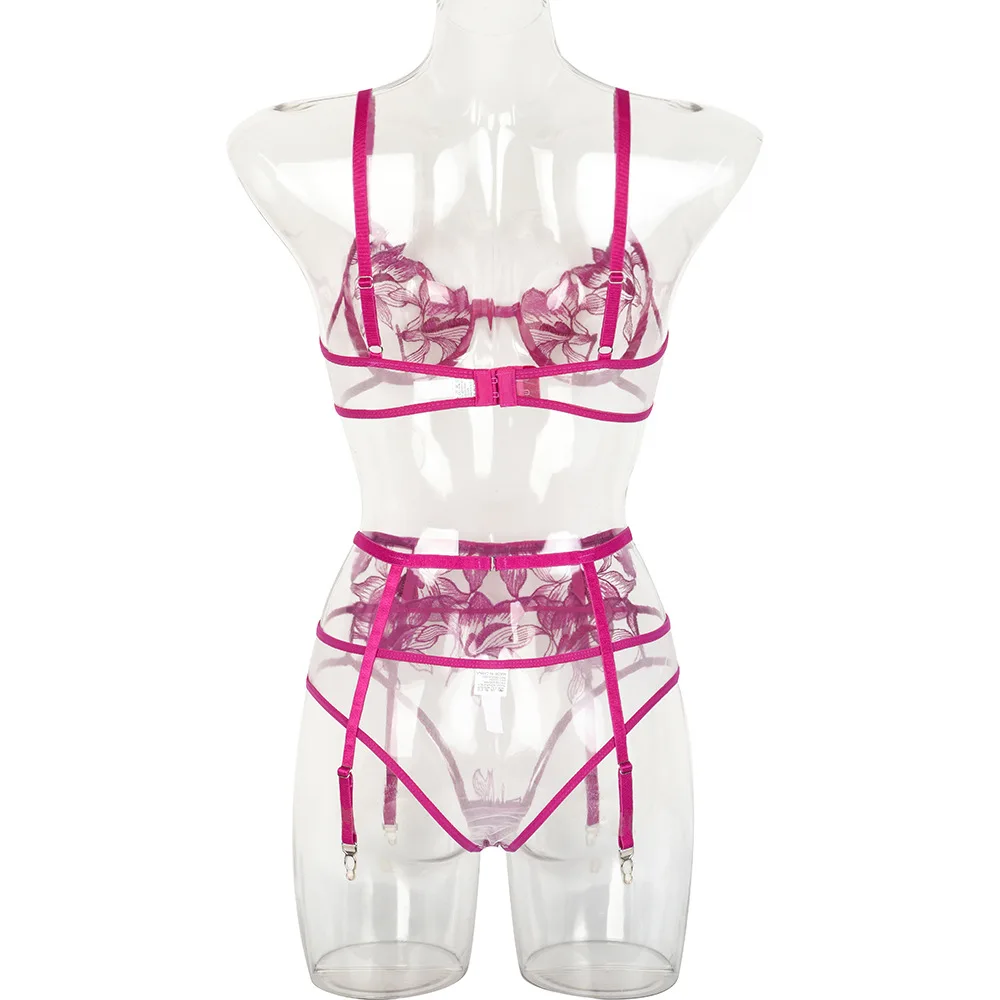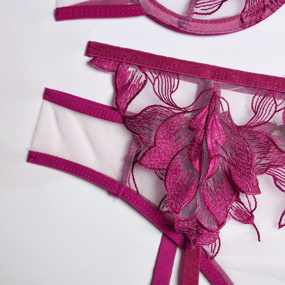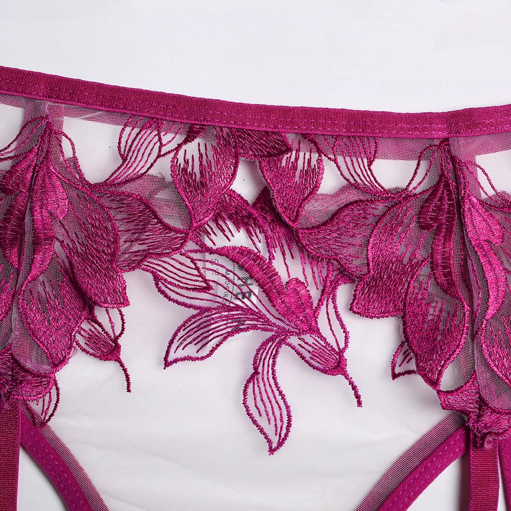 3 Pieces Set Women Sexy Embroidery Sensual Lingerie Underwear Lace Erotic Bra Garters and Brief Set Perspective Exotic Underwear