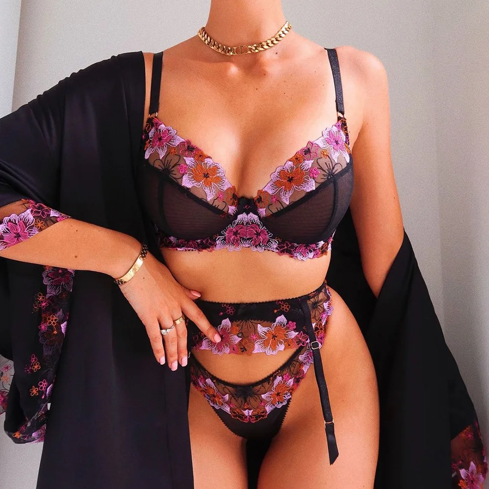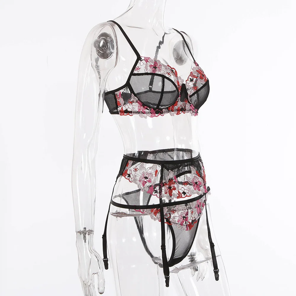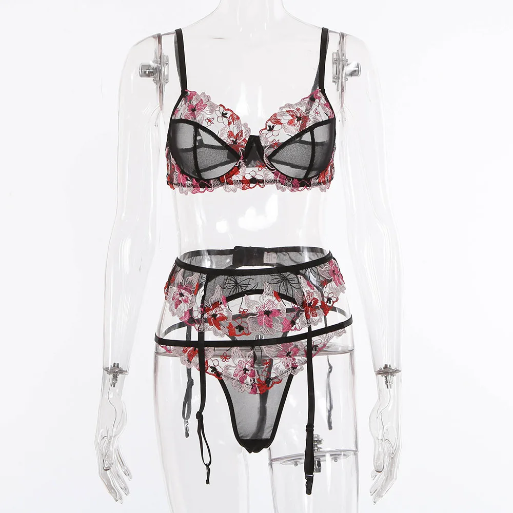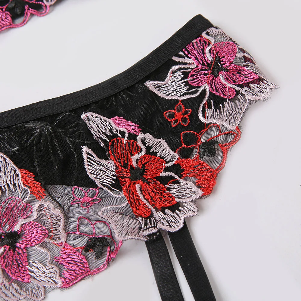 3 Pieces Set Women Sexy Floral Embroidery Underwear Perspective Erotic Bra and Briefs Set with Garter Sensual Lingerie Night Set