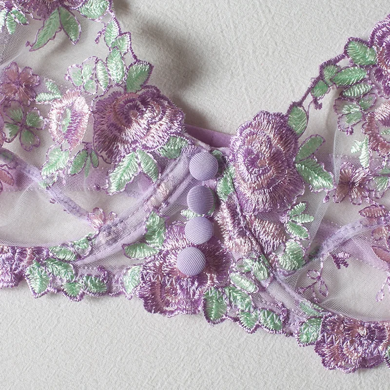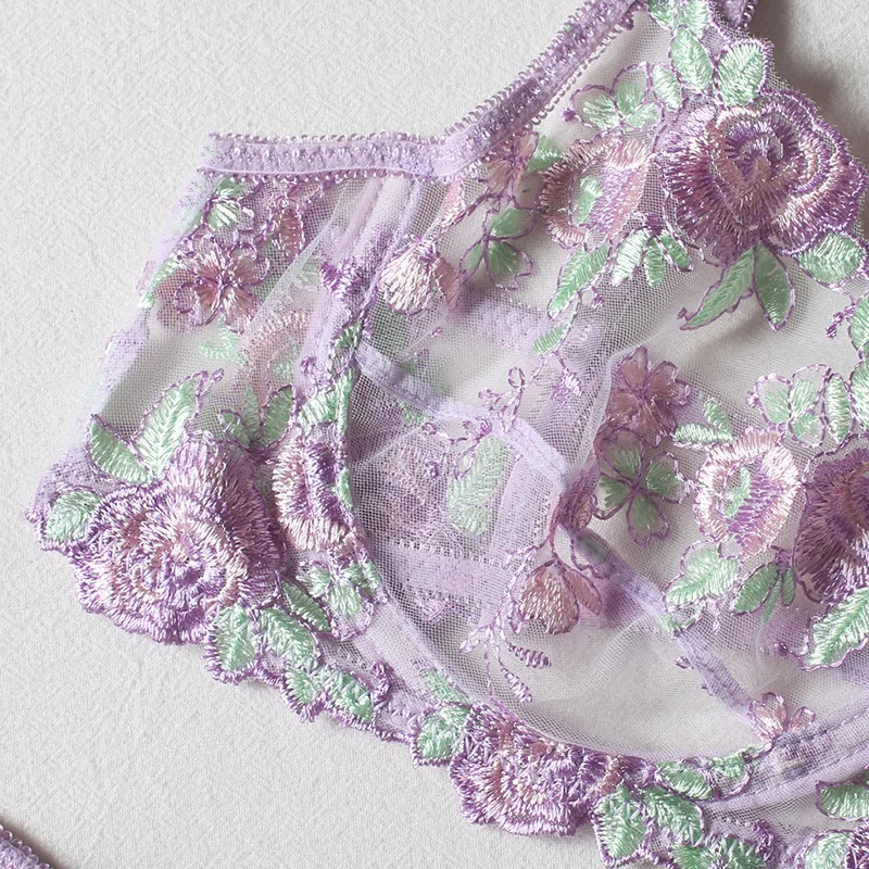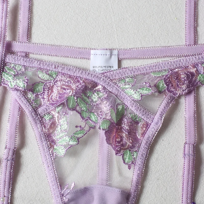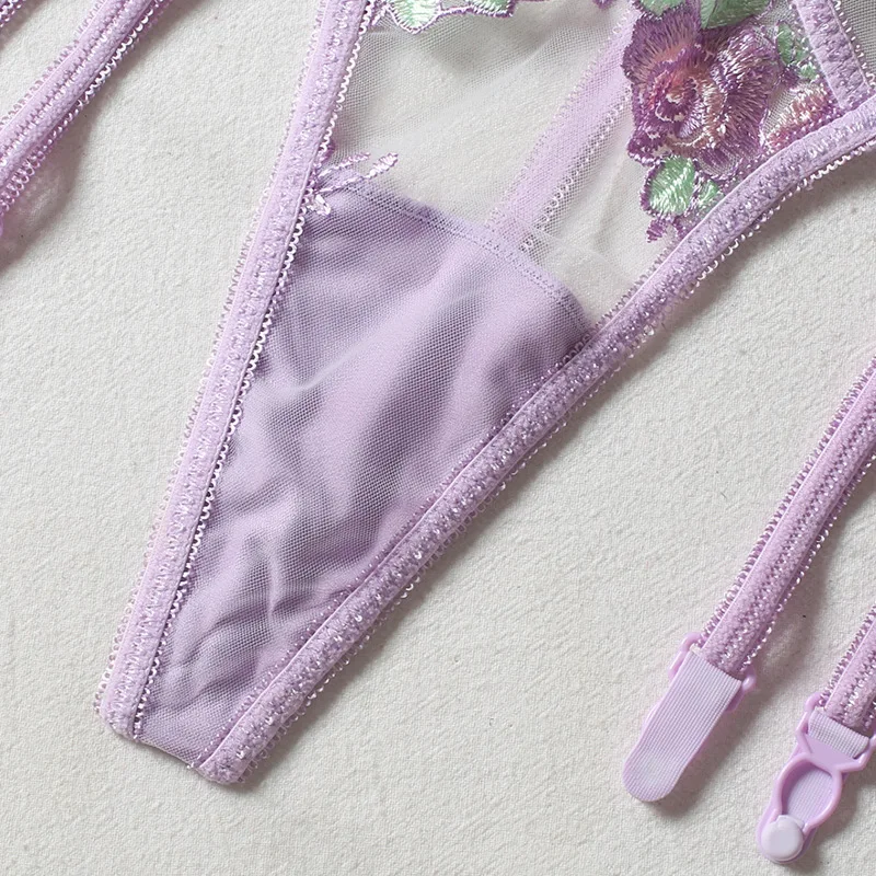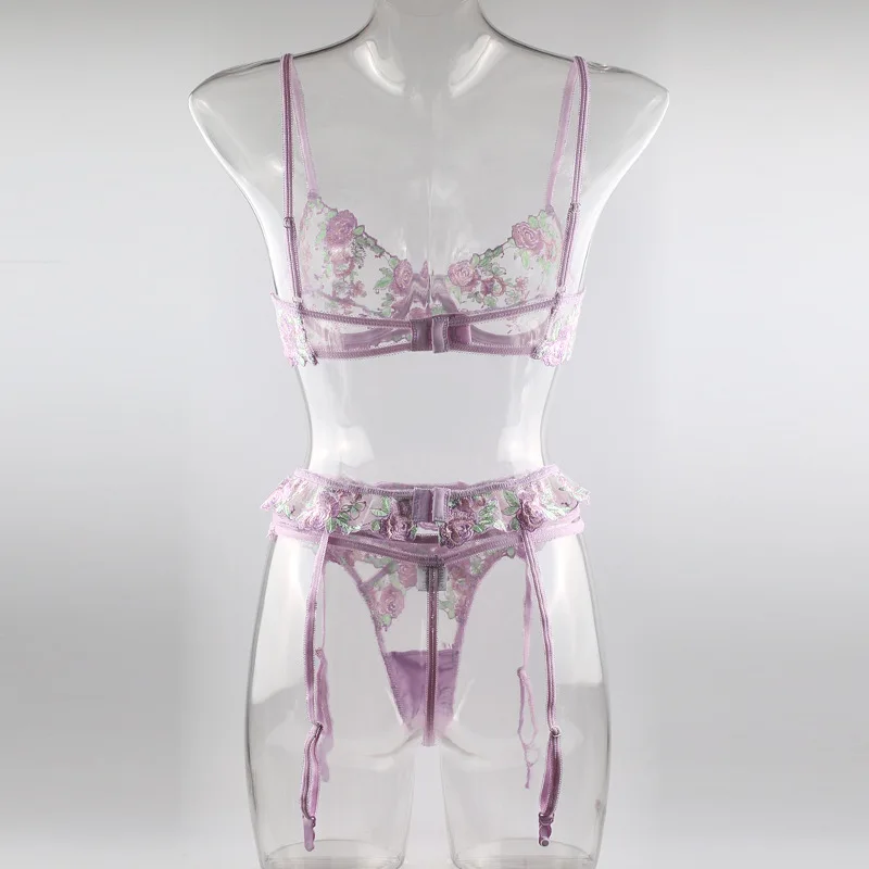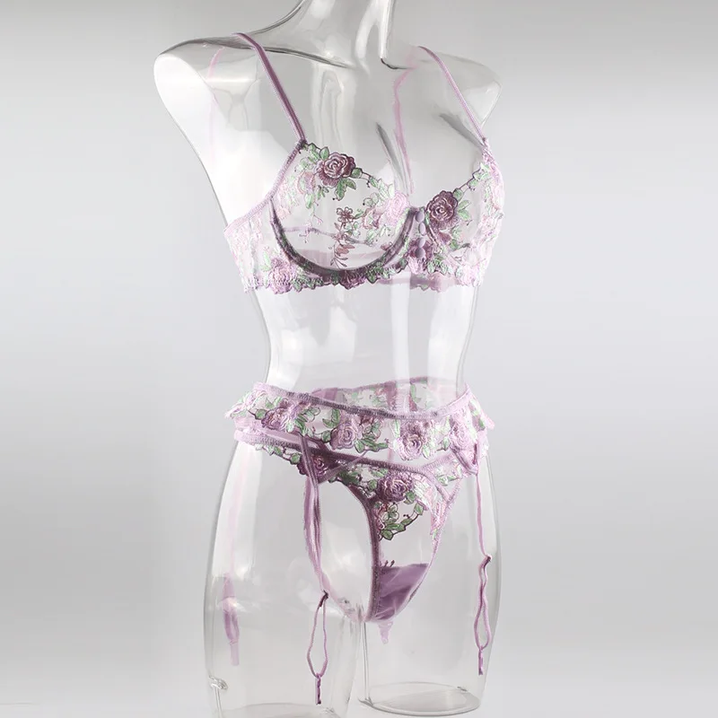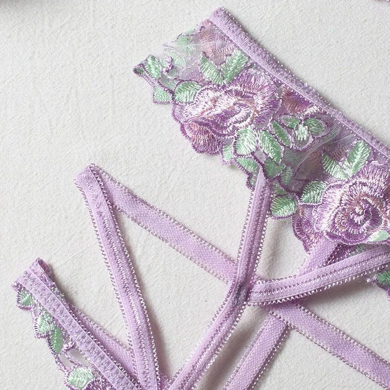3 Pieces Set Women Sexy Lingerie Underwear Set Thigh Garters Floral Embroidery Bra and Brief Set Temptation Erotic Underwear Set
