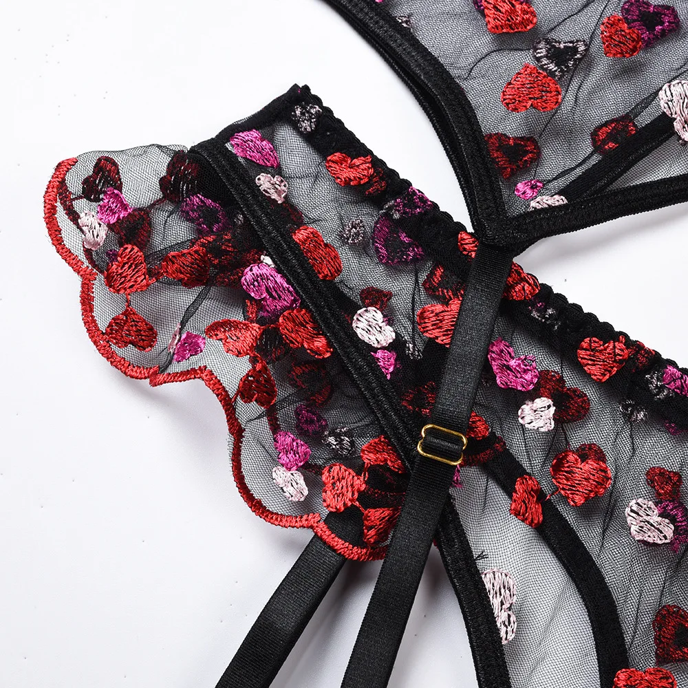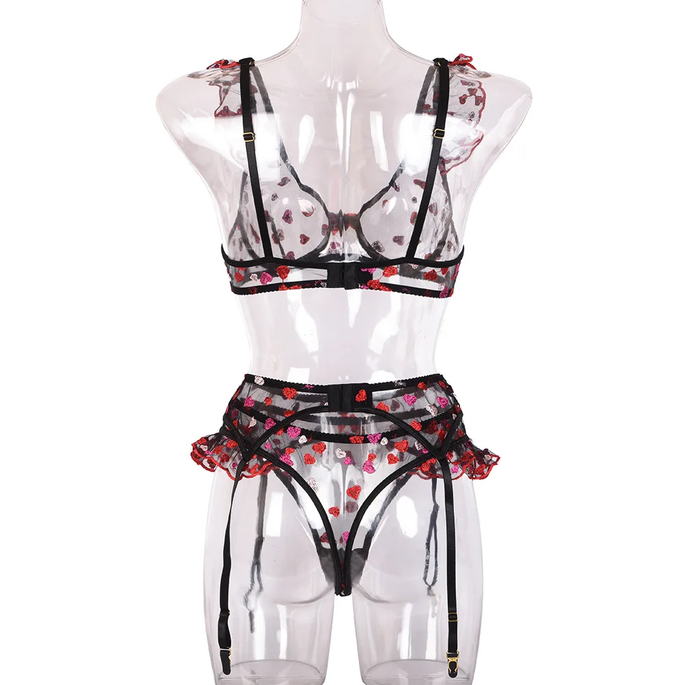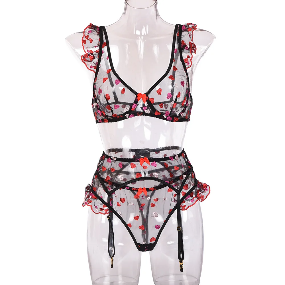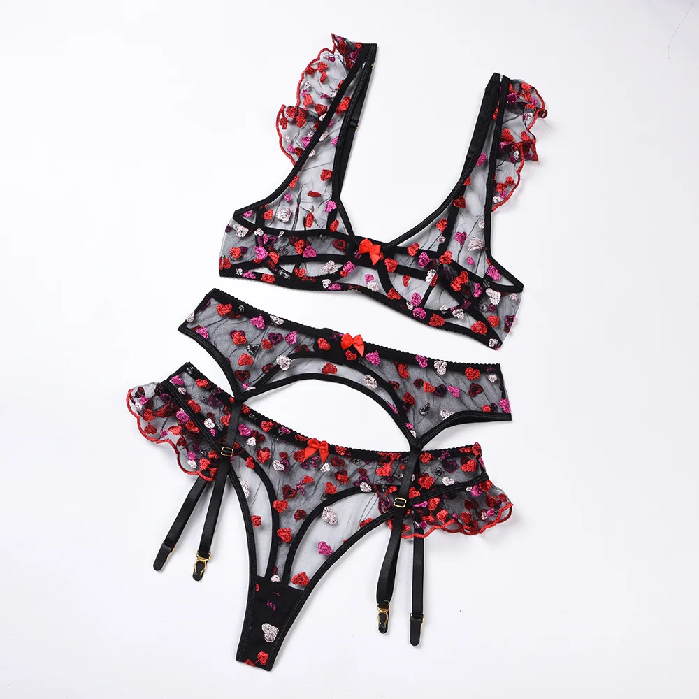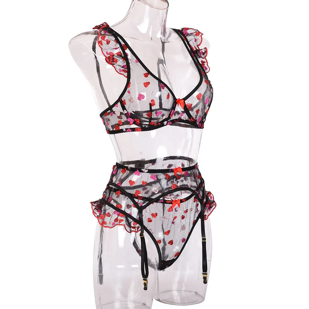 3 Pieces Women Sexy Ruffled Embroidery Underwear See-Through Heart-Shaped Erotic Sensual Lingerie Underwire Exotic Bra and Thong