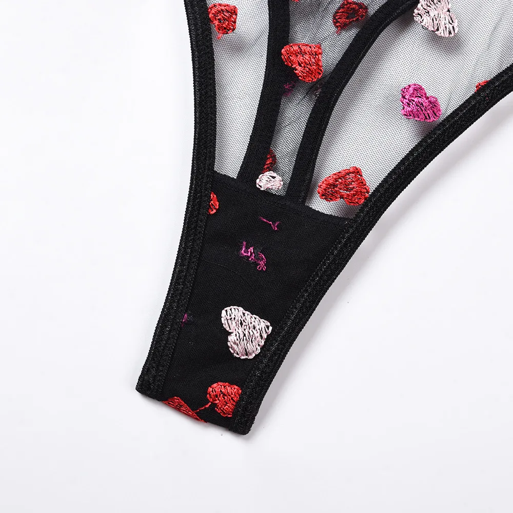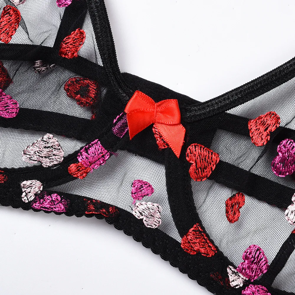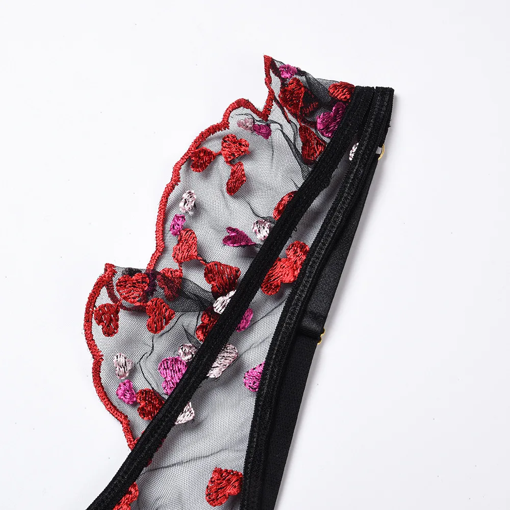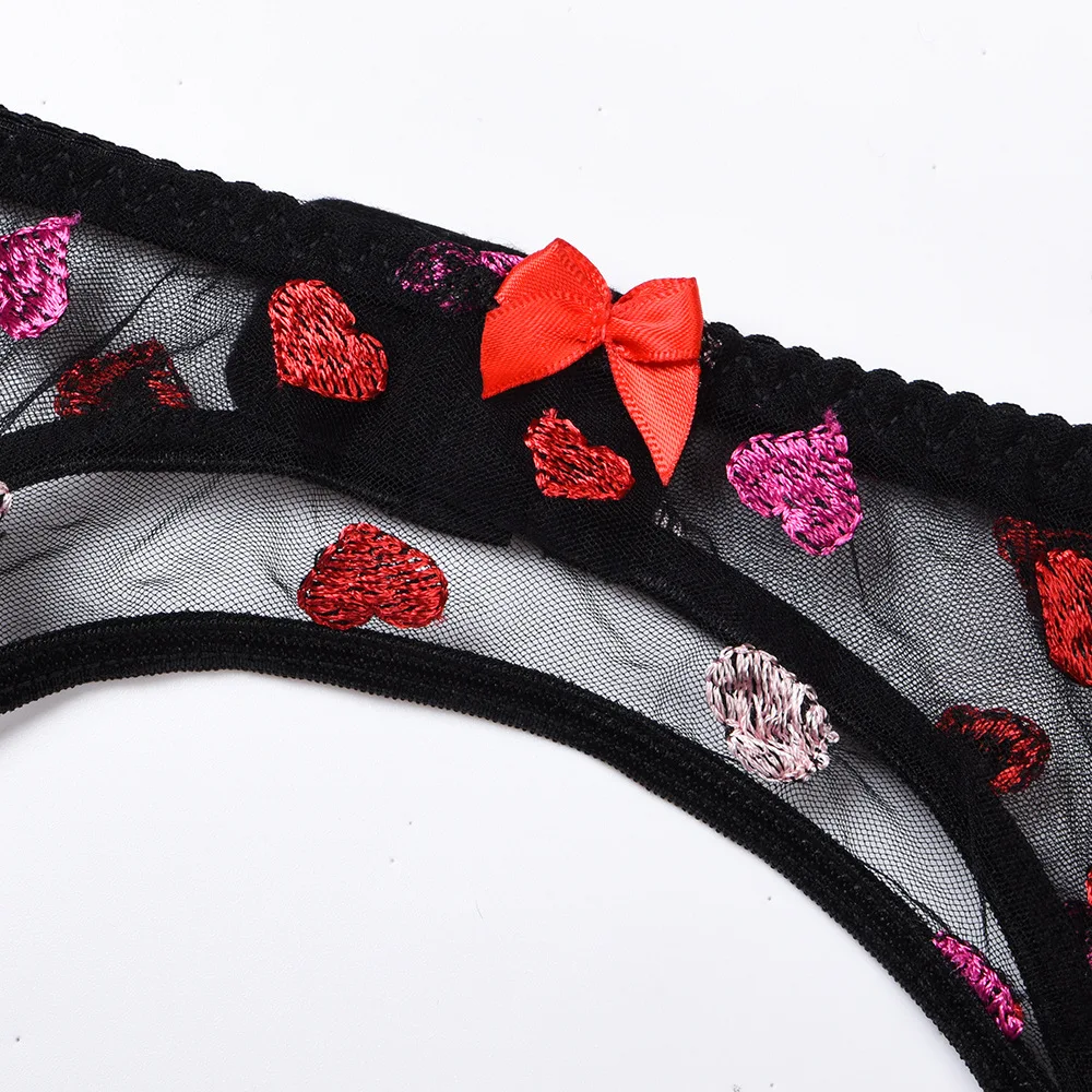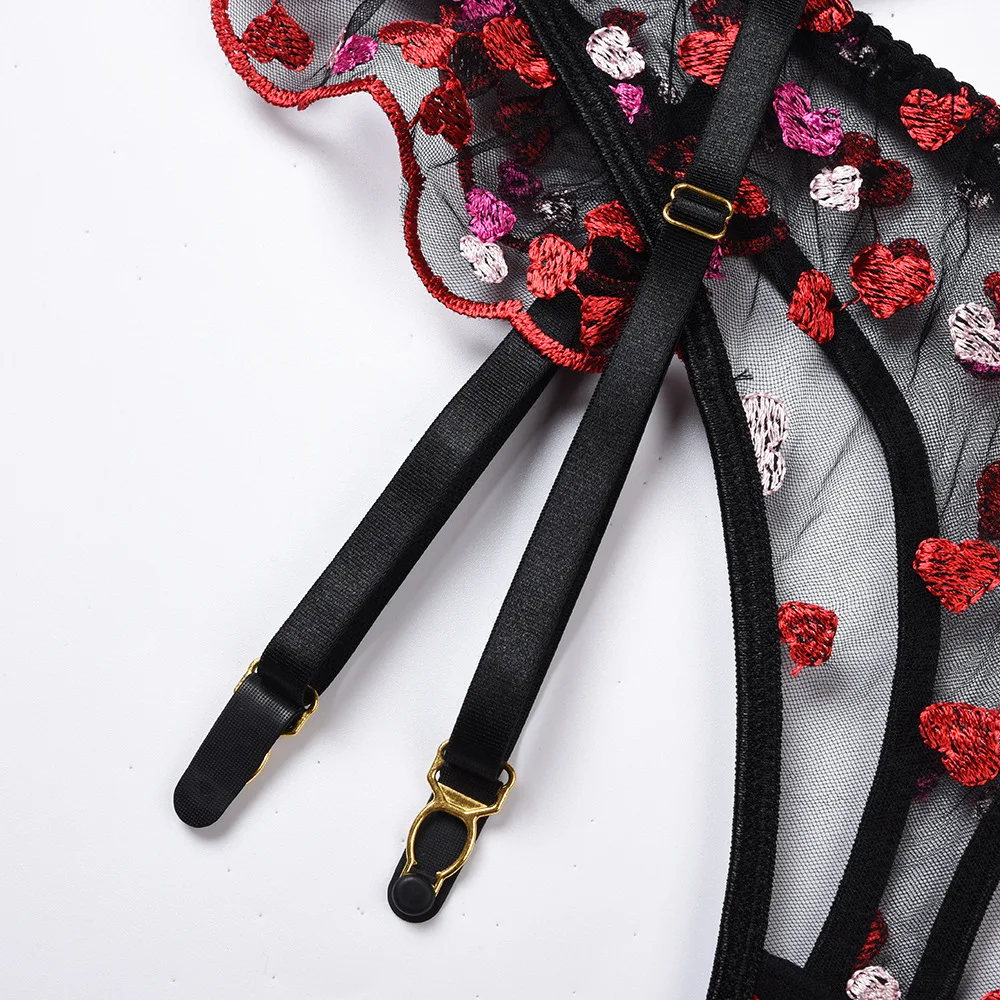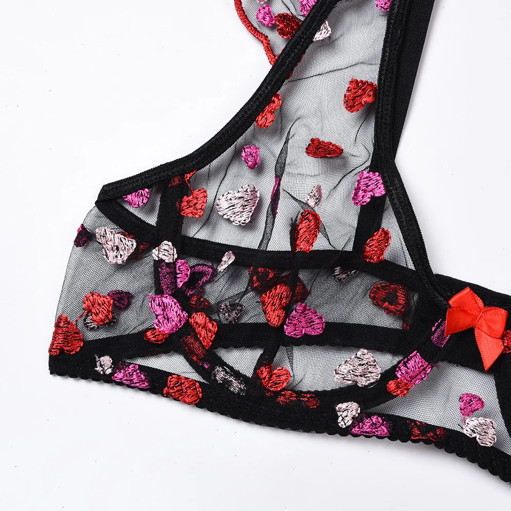 3 Pieces Women Sexy Ruffled Embroidery Underwear See-Through Heart-Shaped Erotic Sensual Lingerie Underwire Exotic Bra and Thong