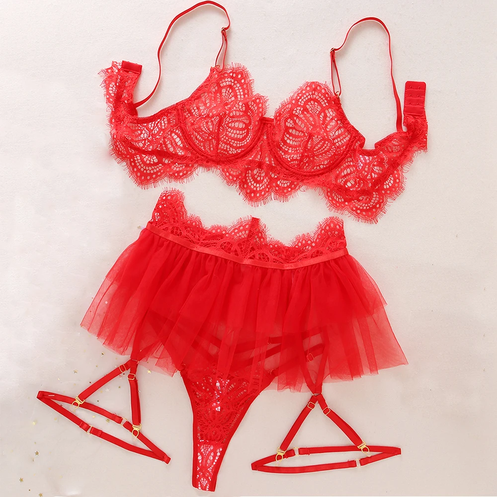 4 Pieces Set Red Sensual Lingerie Sexy Ruffled Underwear Push Up with Garters Exotic Costumes Erotic Porn Intimate Underwear Set