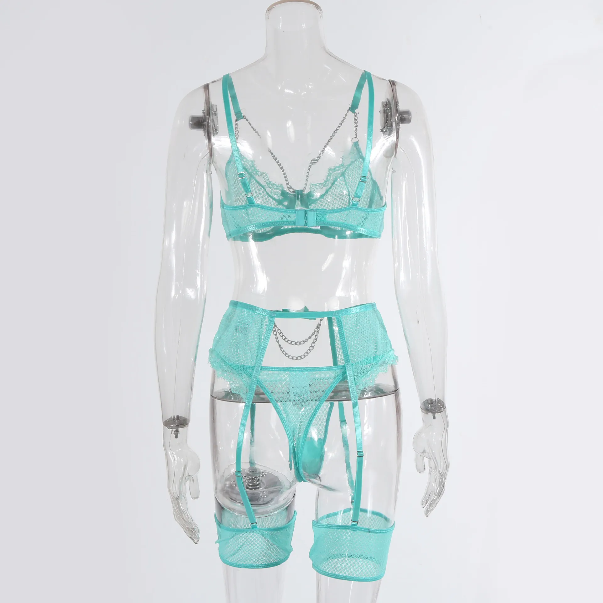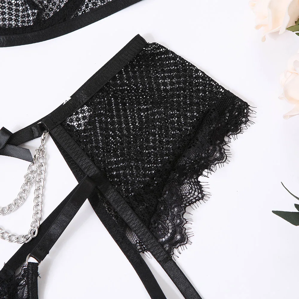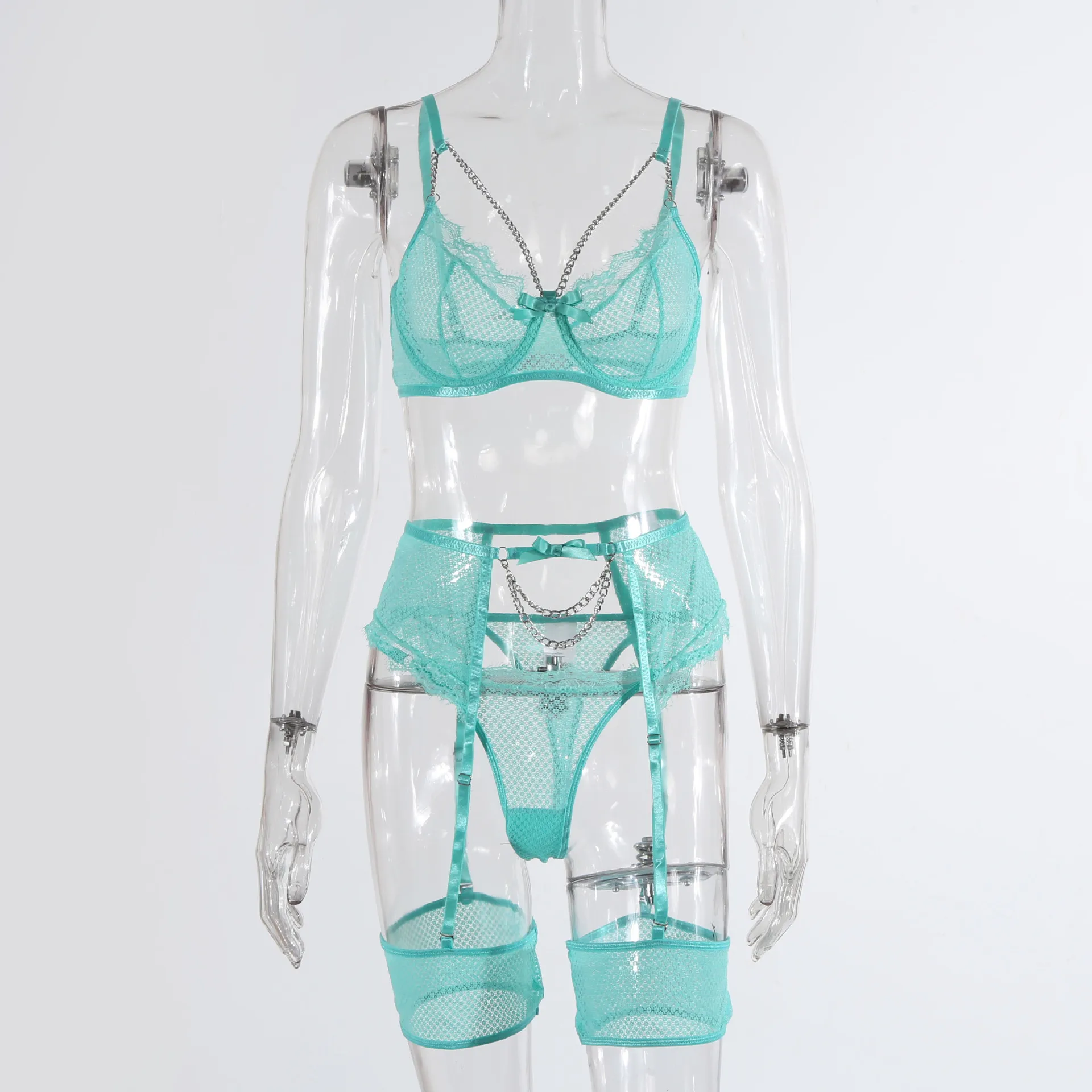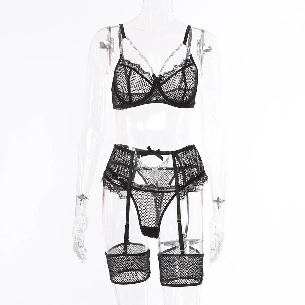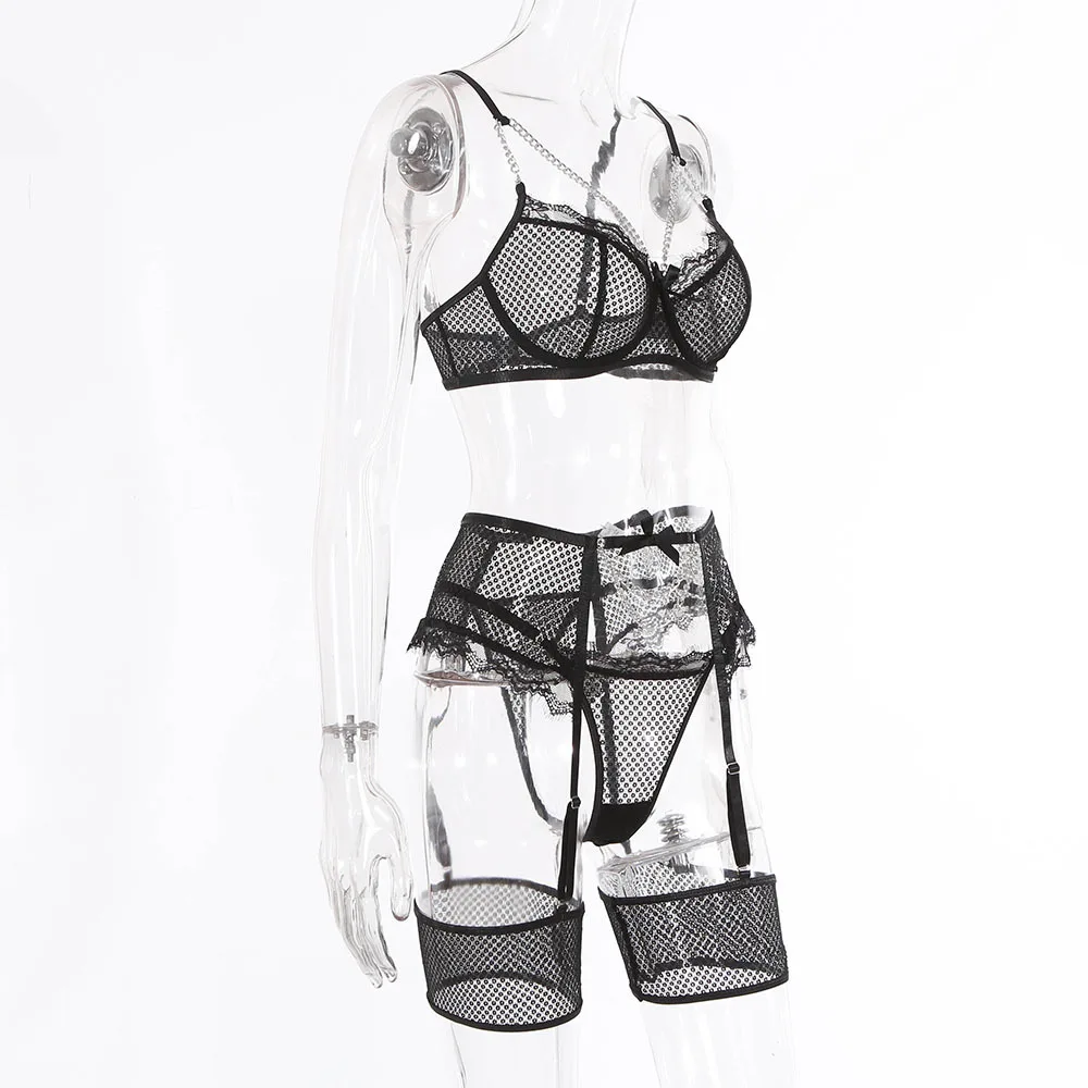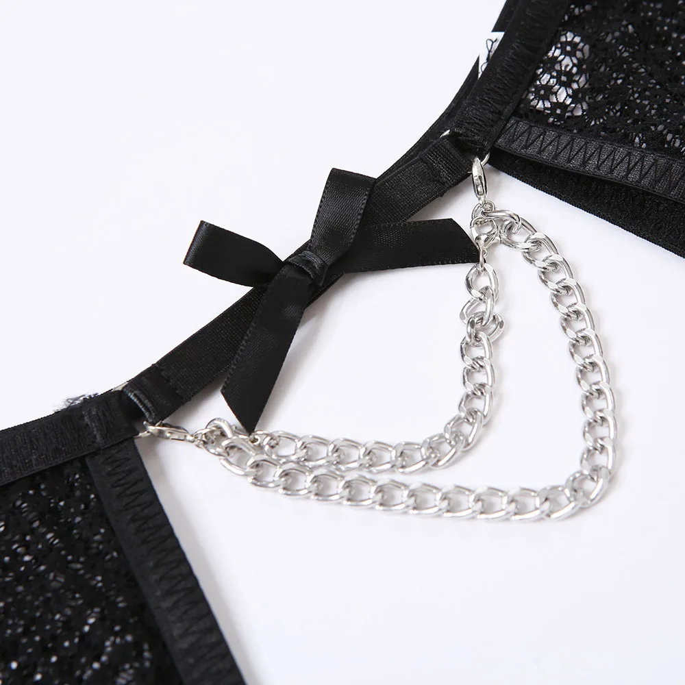 4 Pieces Set Sexy Sensual Lingerie Bondage Underwear Metal Chain Erotic Mesh Push Up Bra and Thong with Garters Erotic Costumes