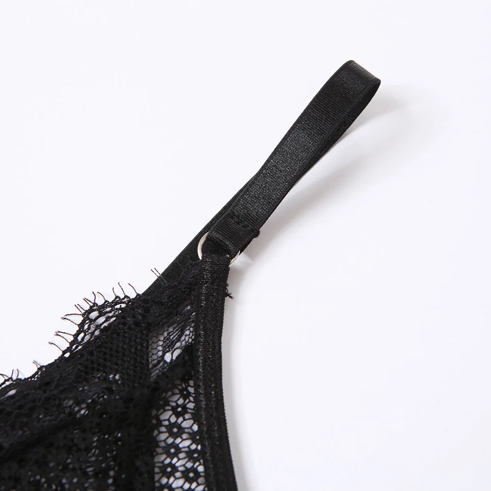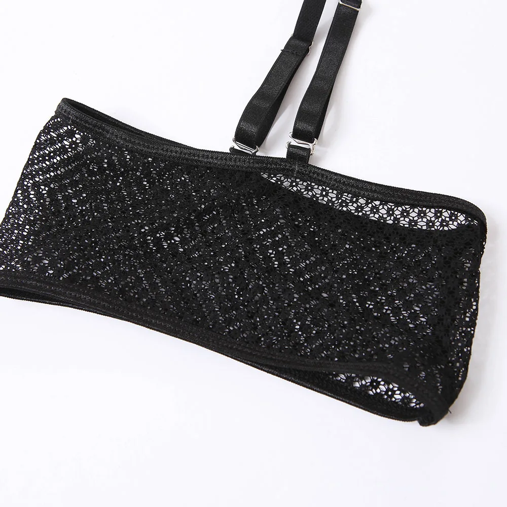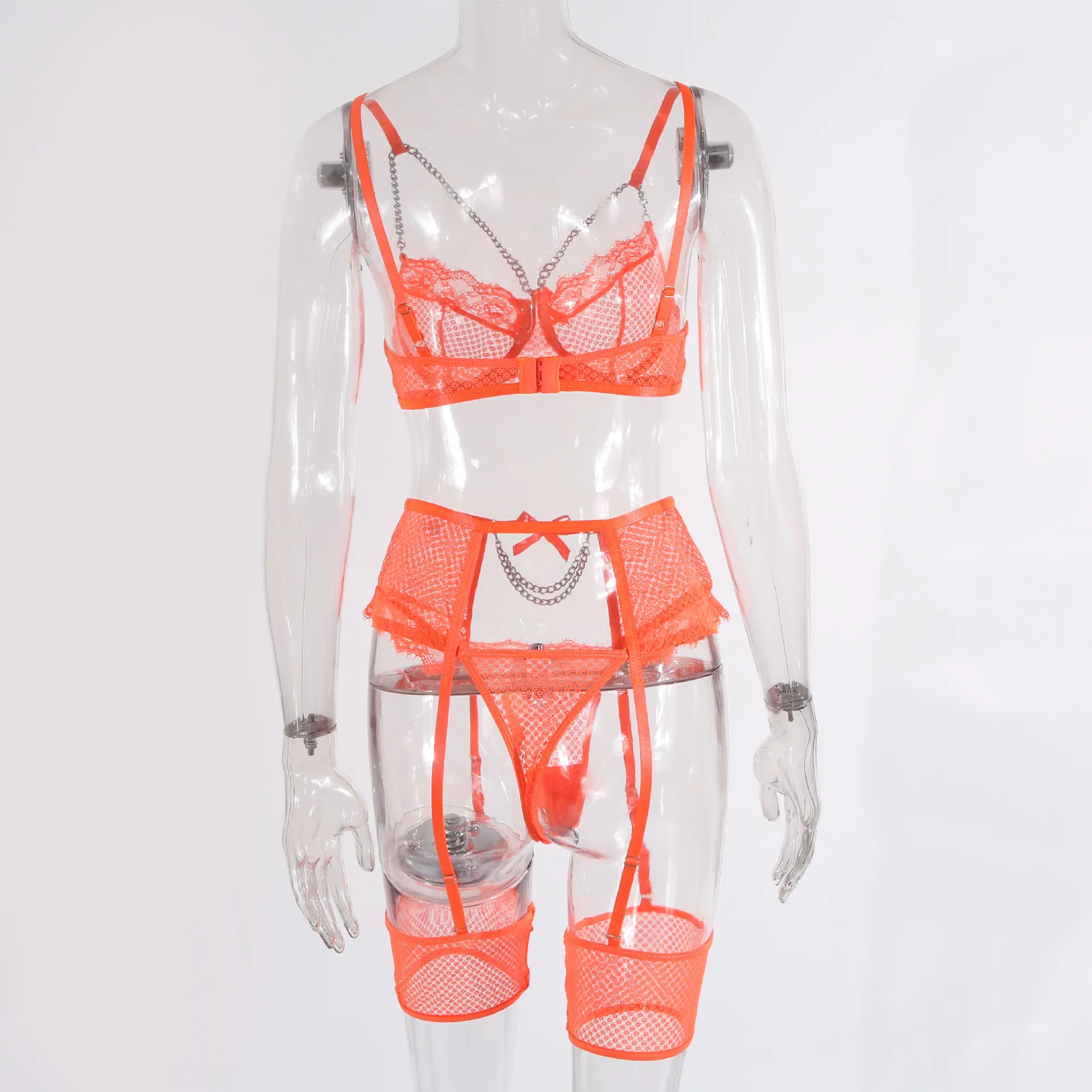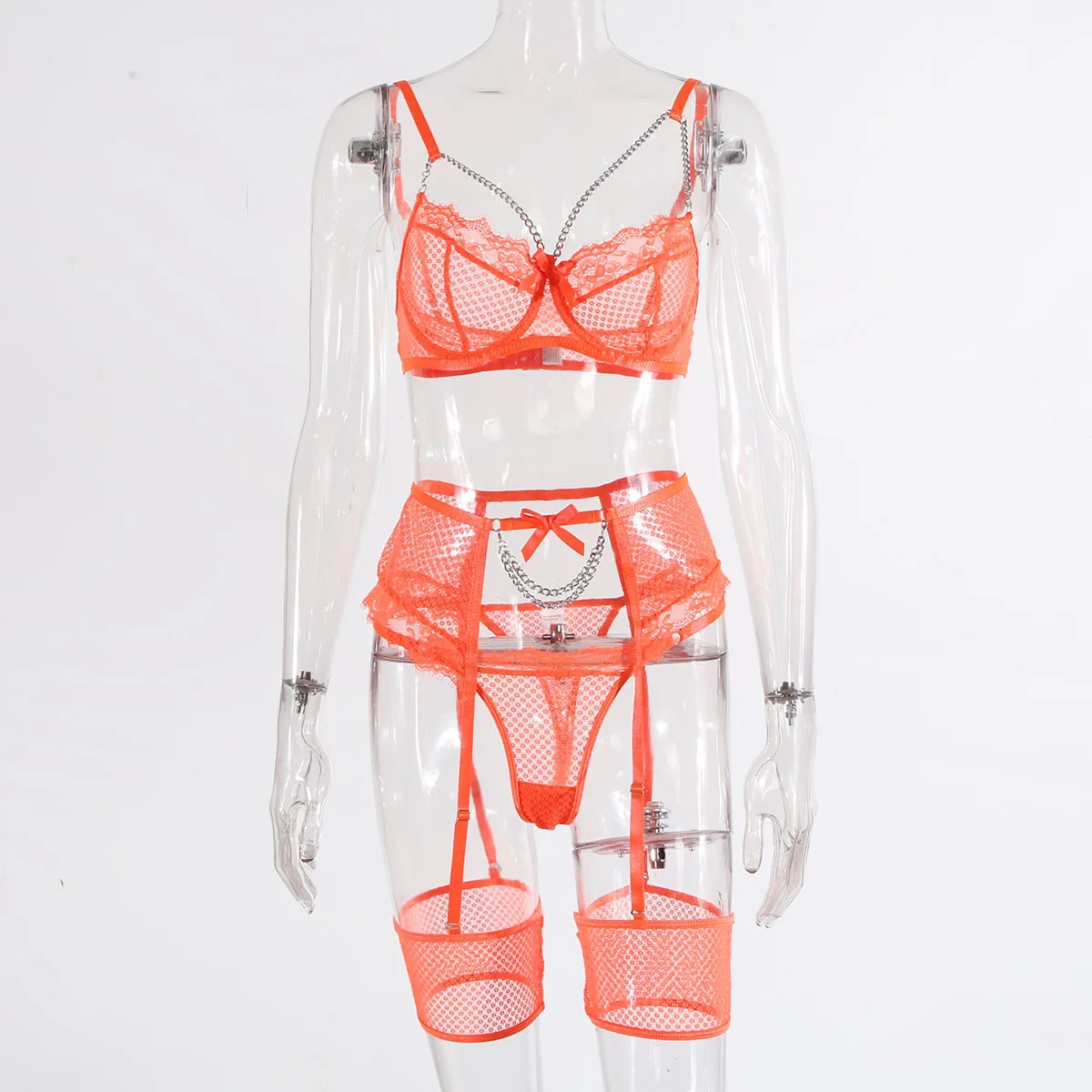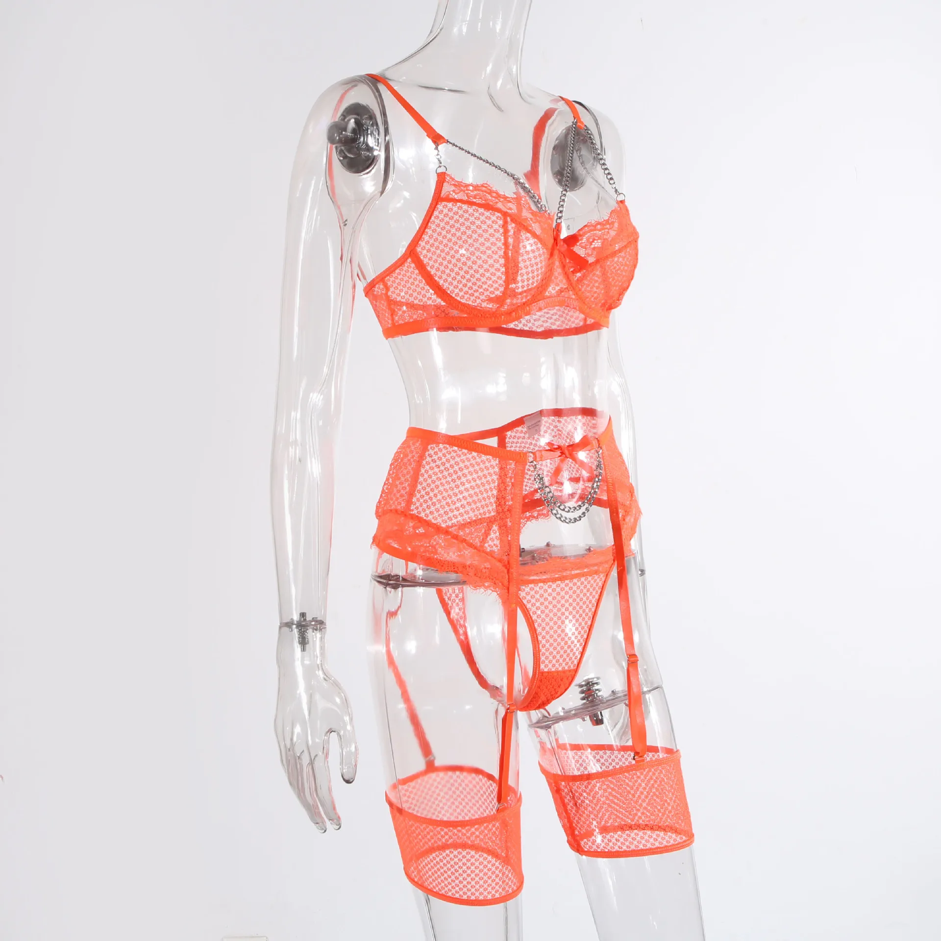 4 Pieces Set Sexy Sensual Lingerie Bondage Underwear Metal Chain Erotic Mesh Push Up Bra and Thong with Garters Erotic Costumes