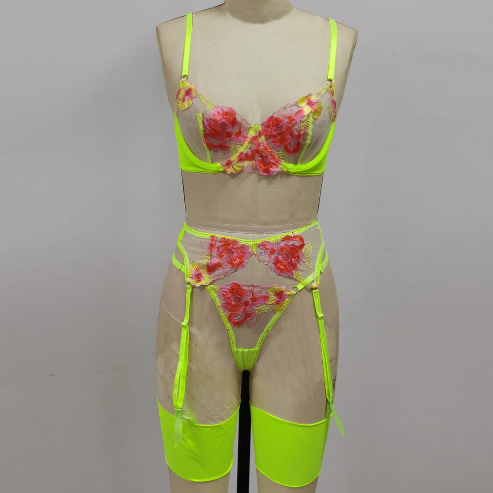 4 Pieces Set Women Sexy Embroidery Sensual Lingerie Underwear Lace Flower Erotic Underwire Bra Transparent Exotic Underwear