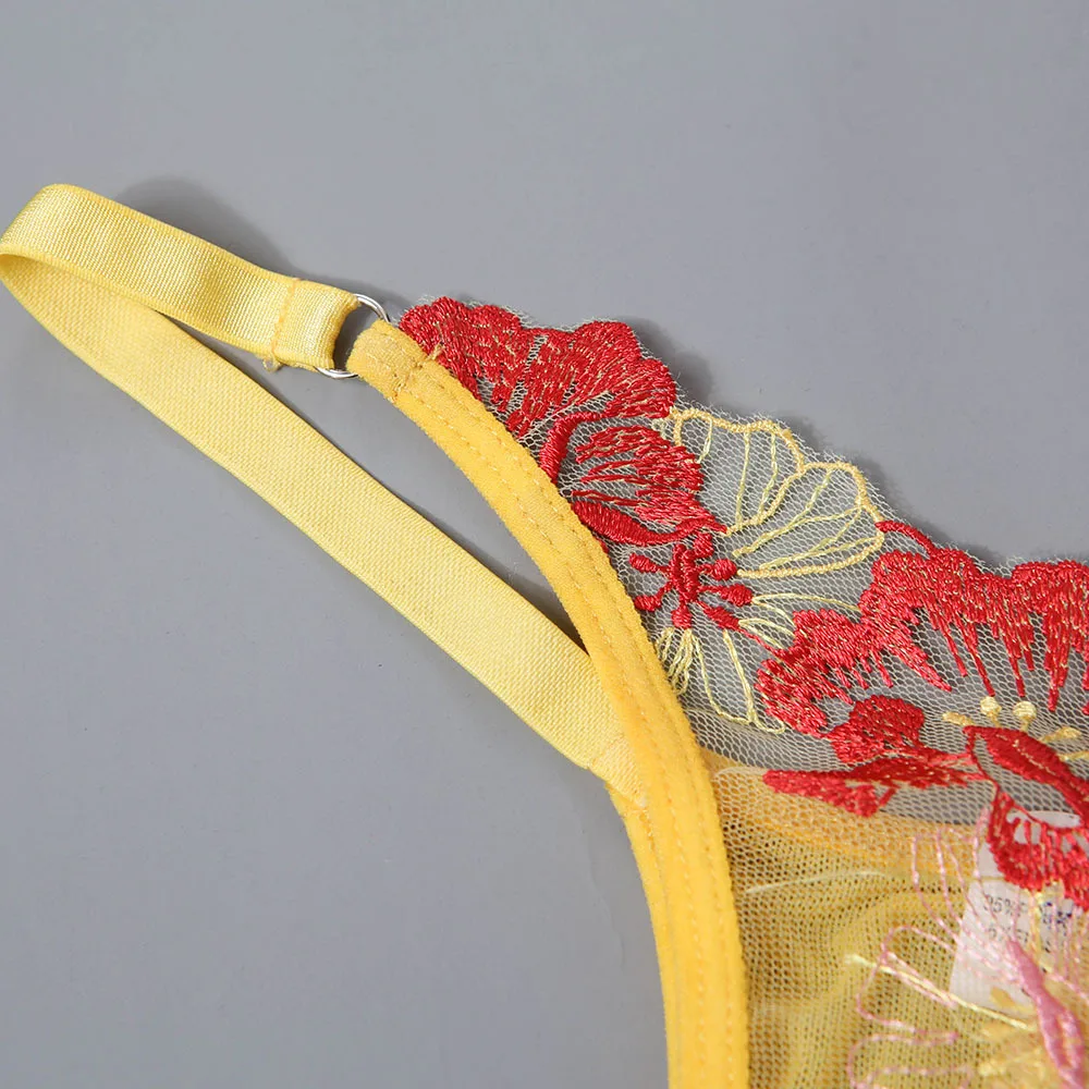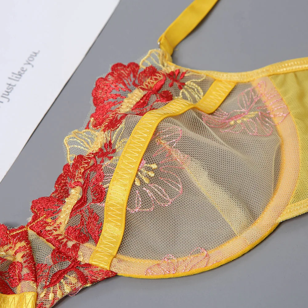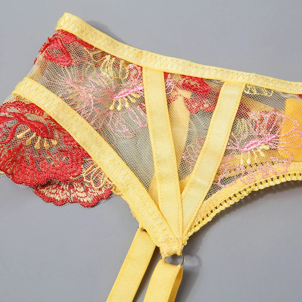 4 Pieces Set Women Sexy Lingerie Underwear Set Thigh Garters Floral Embroidery Bra and Panty Mesh Erotic Sex Underwear Set