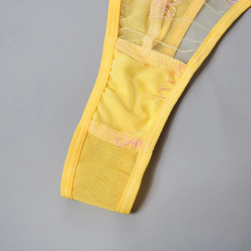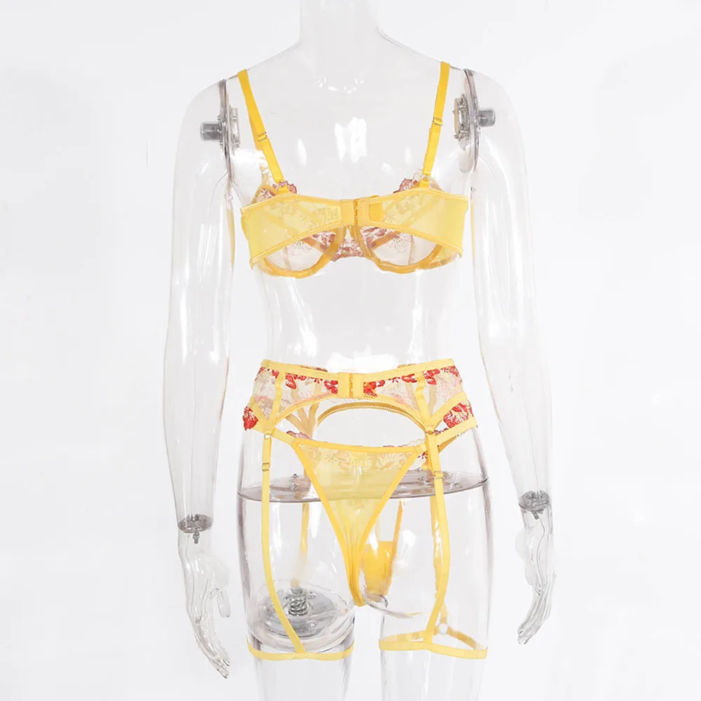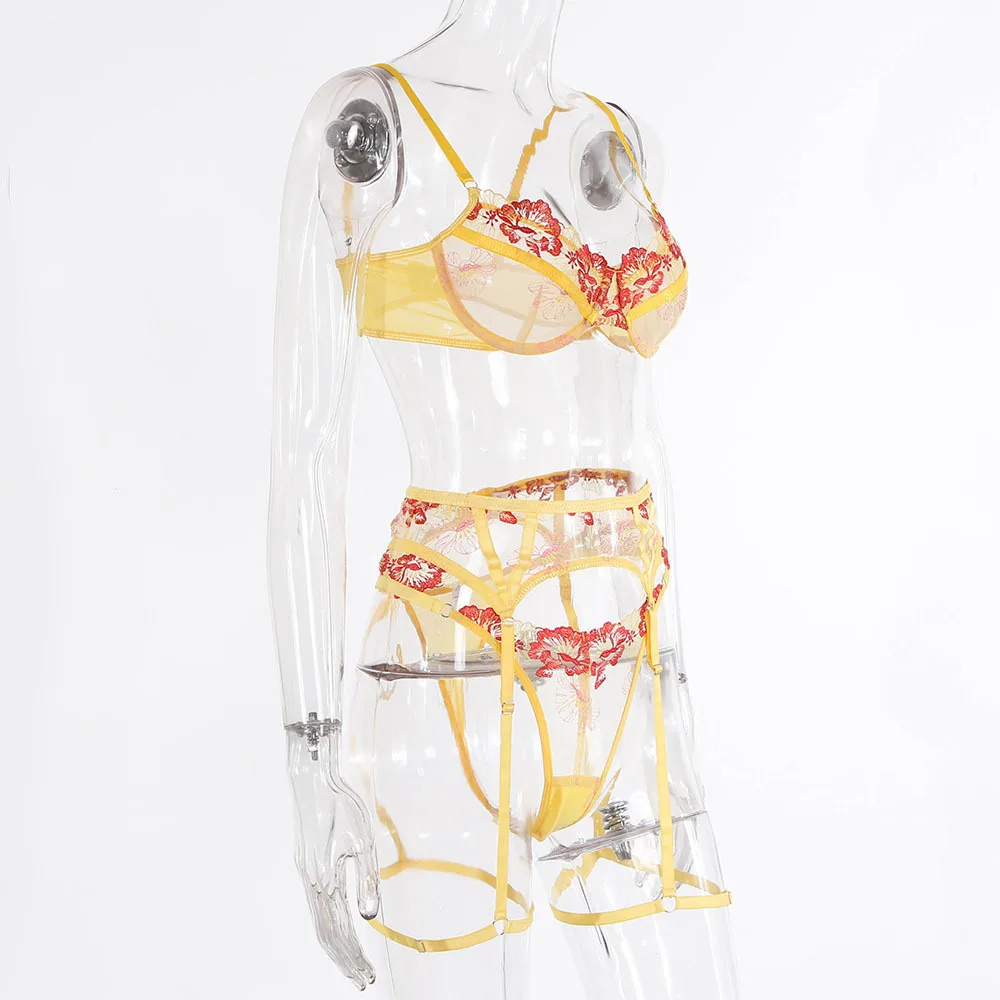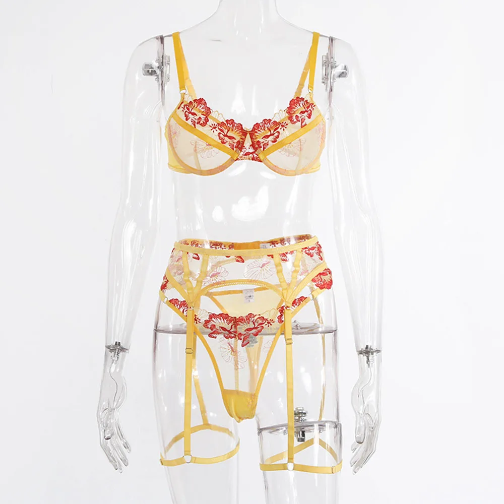 4 Pieces Set Women Sexy Lingerie Underwear Set Thigh Garters Floral Embroidery Bra and Panty Mesh Erotic Sex Underwear Set