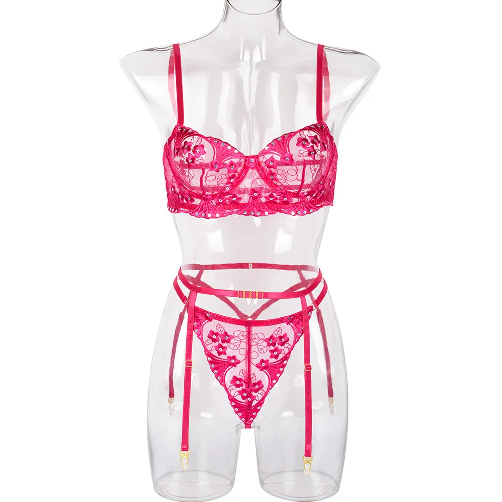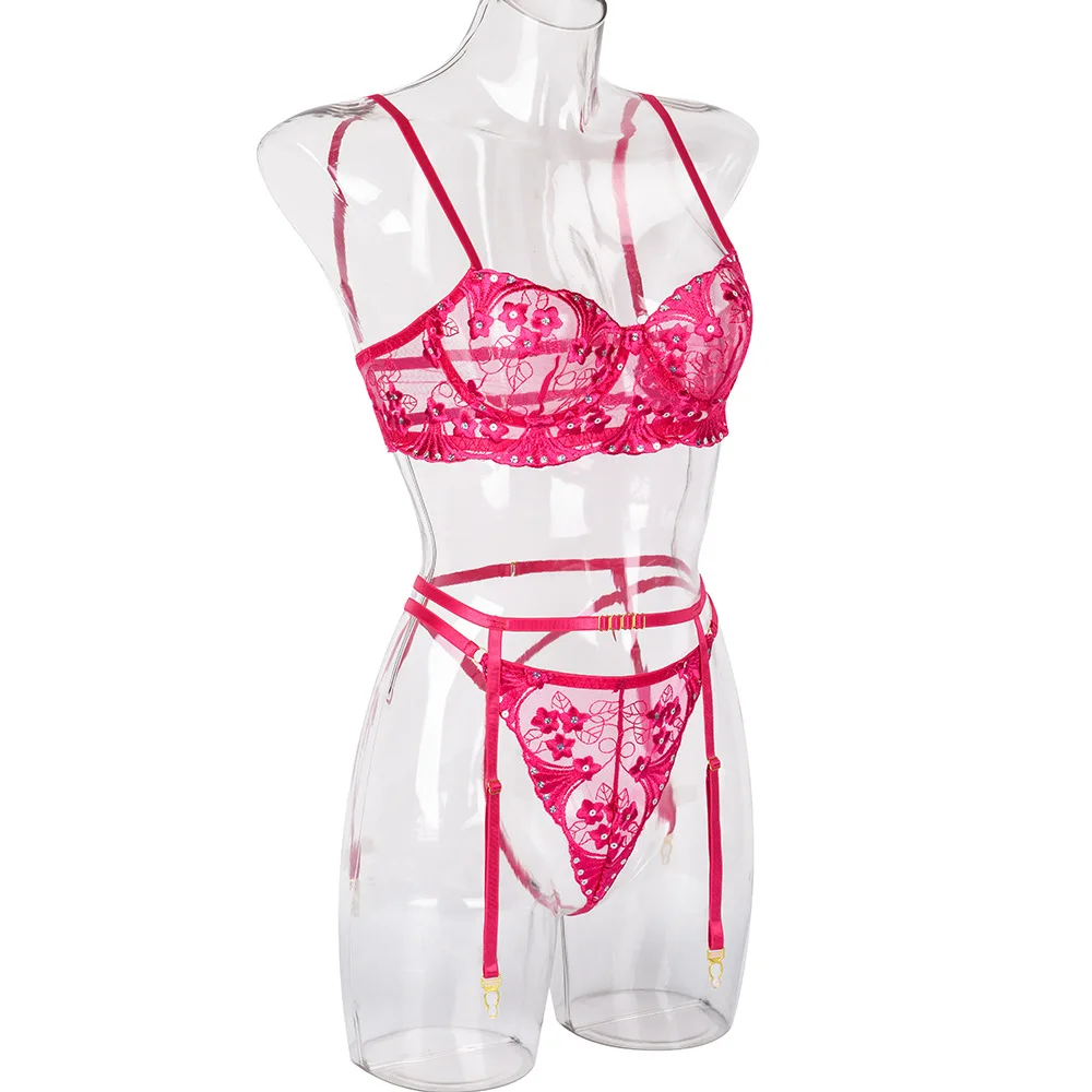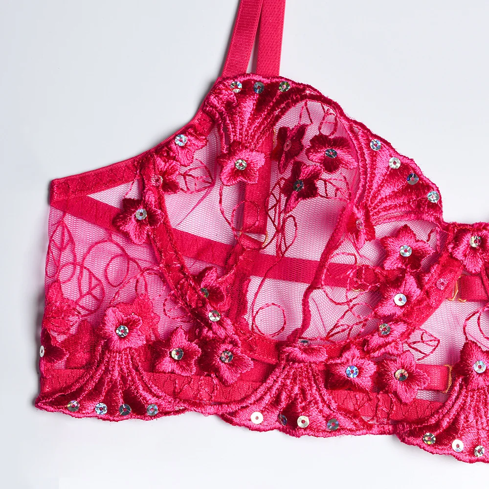 4 Pieces Women Sexy Floral Embroider Underwear See-Through Erotic Costumes Bra and Thong Sensual Lingerie Exotic Underwire Set