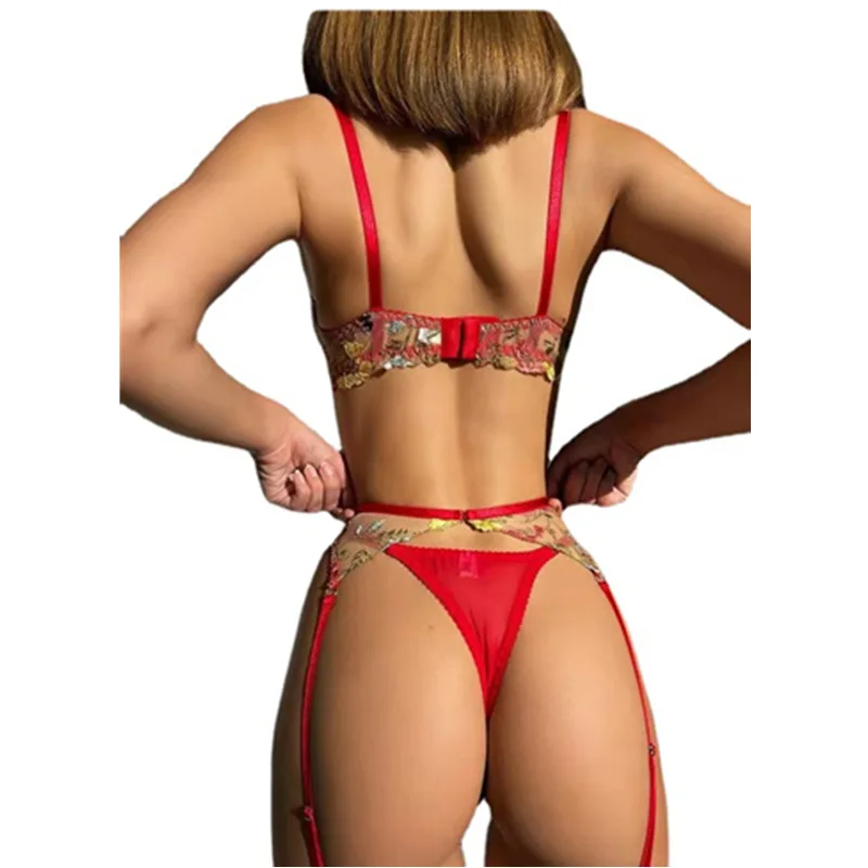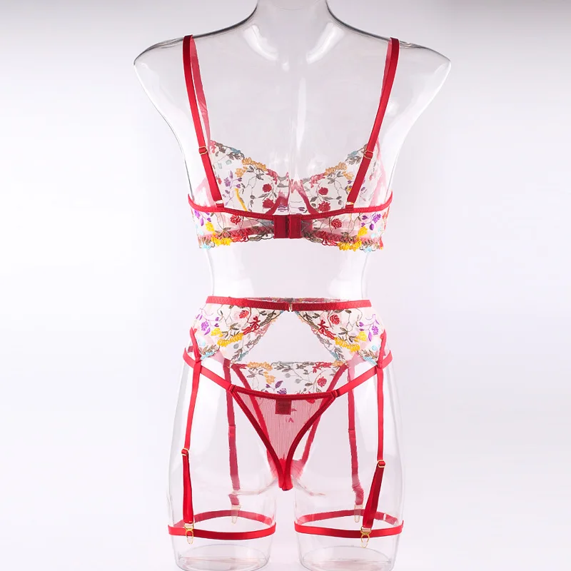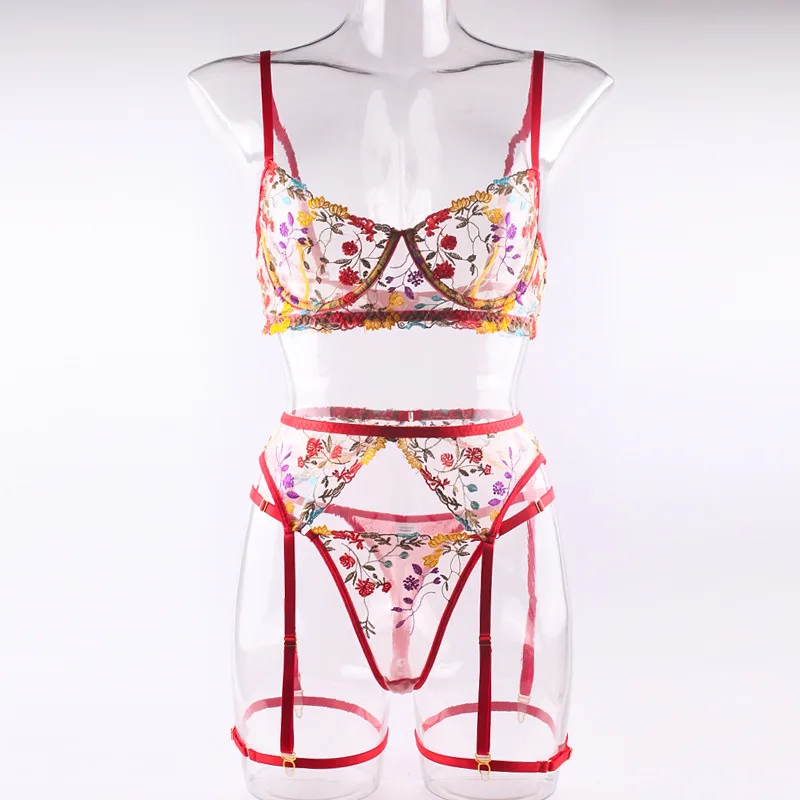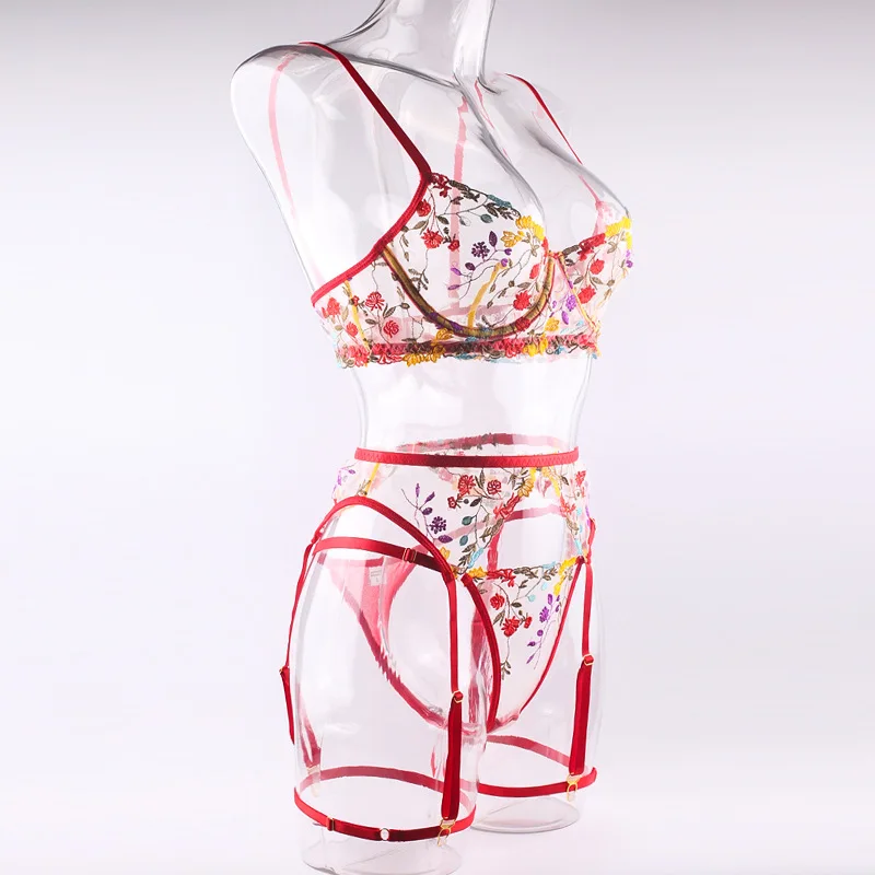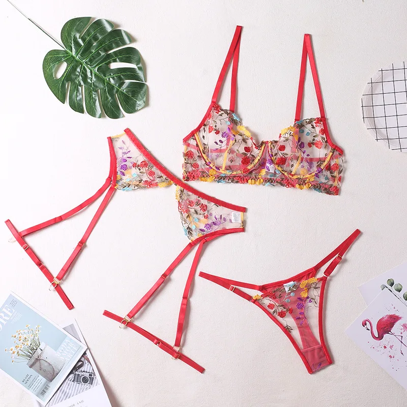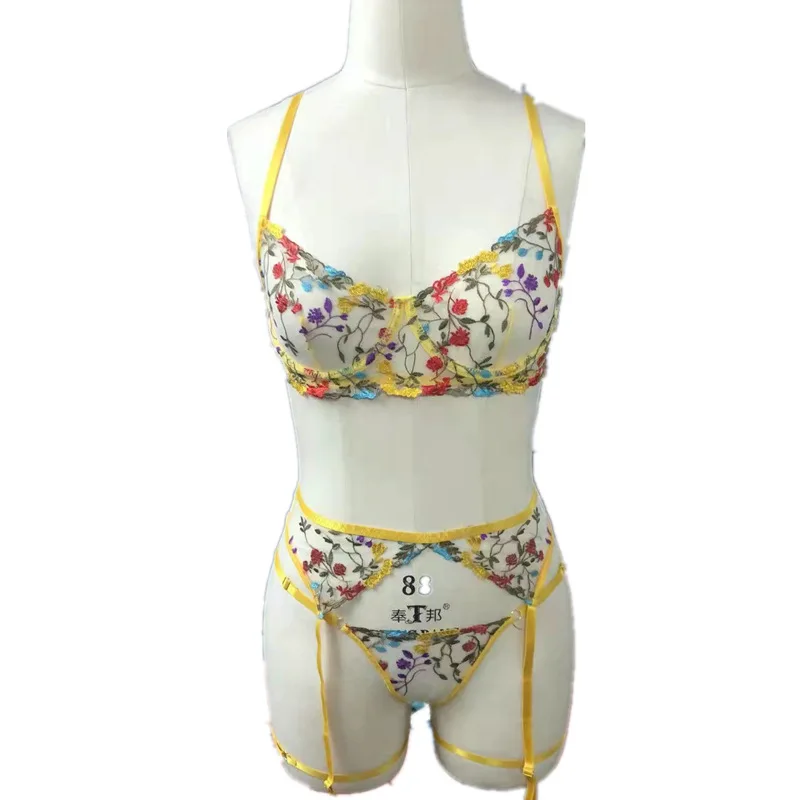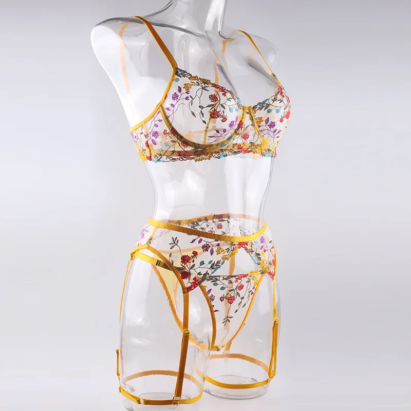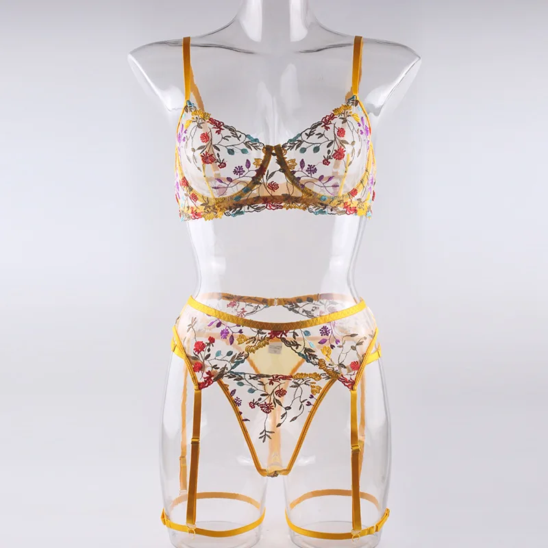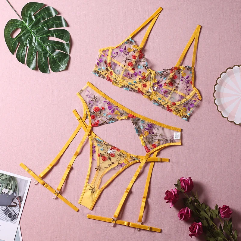 4 Pieces Women Sexy Lingerie Yellow Garden Floral Embroidery Underwear Perspective Bra Garters Sensual Erotic Temptation Set