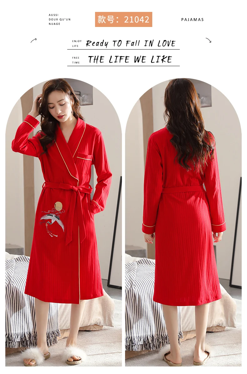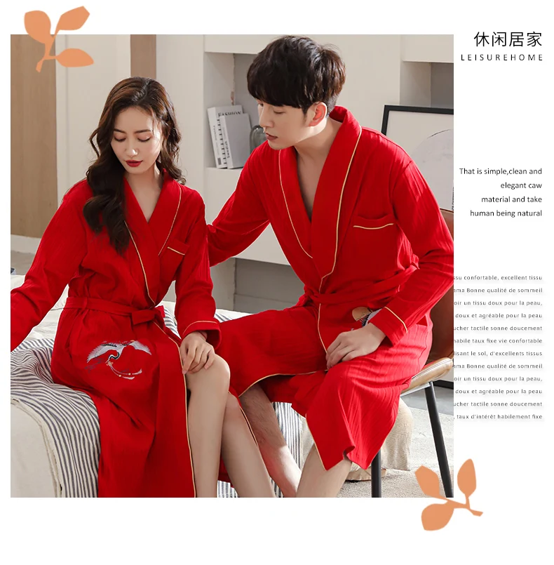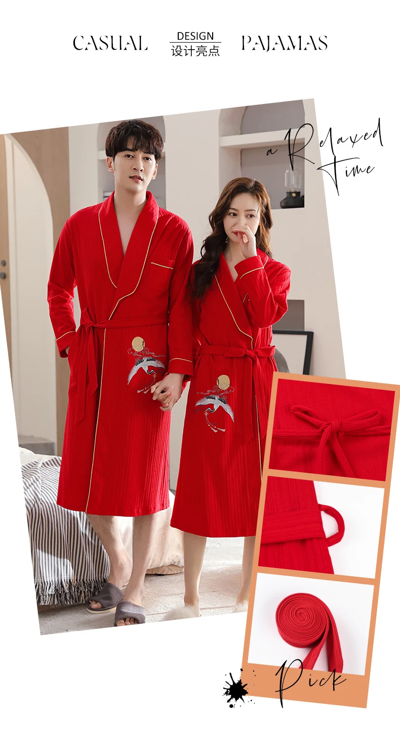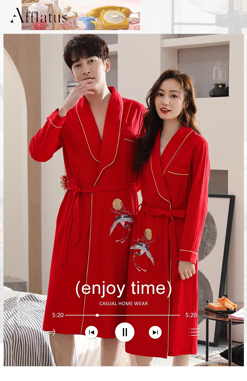 4XL Autumn Bathrobe Couples Cotton Kimono Wedding Festive Red Robes For Male Soild Long Bath Robe Bride Robe Dressing Gown
