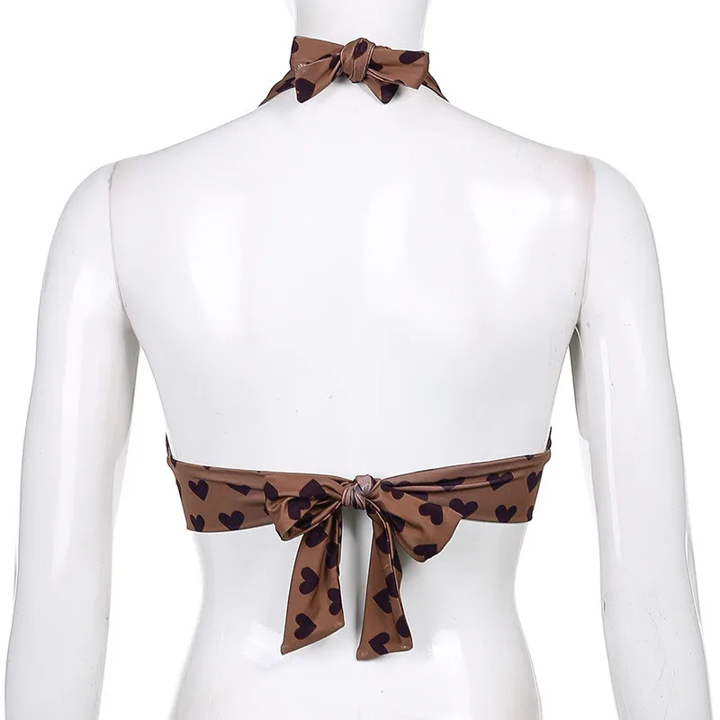 Aesthetic Kawaii Clothes Sweet Pink Heart Print Cute Crop Top Women Sleeveless Backless Lace Up Bralette Camisole