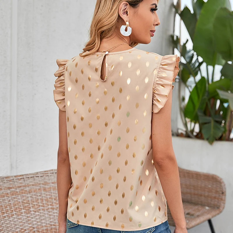 Amercia Prairie Chic Special Glossy Spot Print Crew Collar Petal Sleeves T-Shirt Top In Apricot