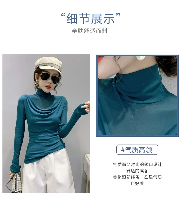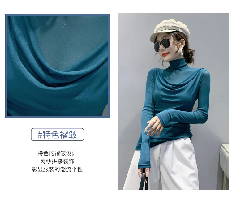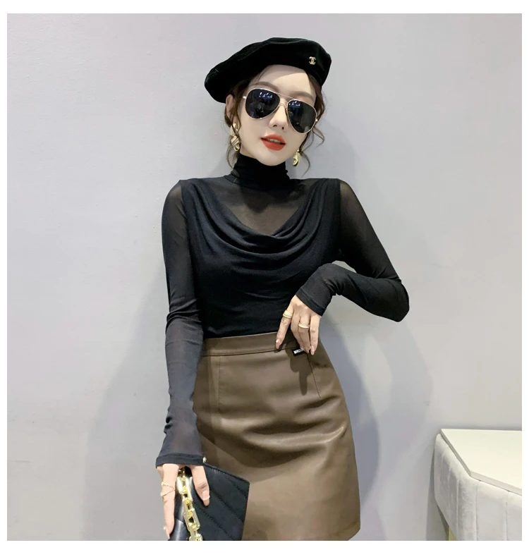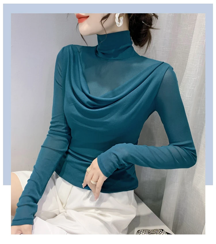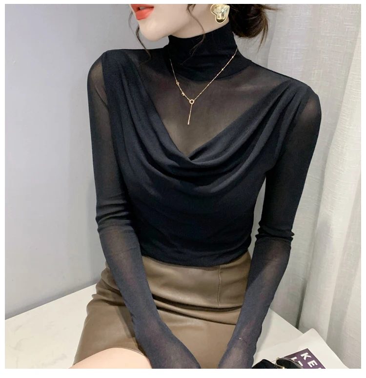Autumn 2021 New Women's T-Shirt Fashion Casual Turtleneck Mesh Shirt Elegant Slim Long Sleeve Female Tops