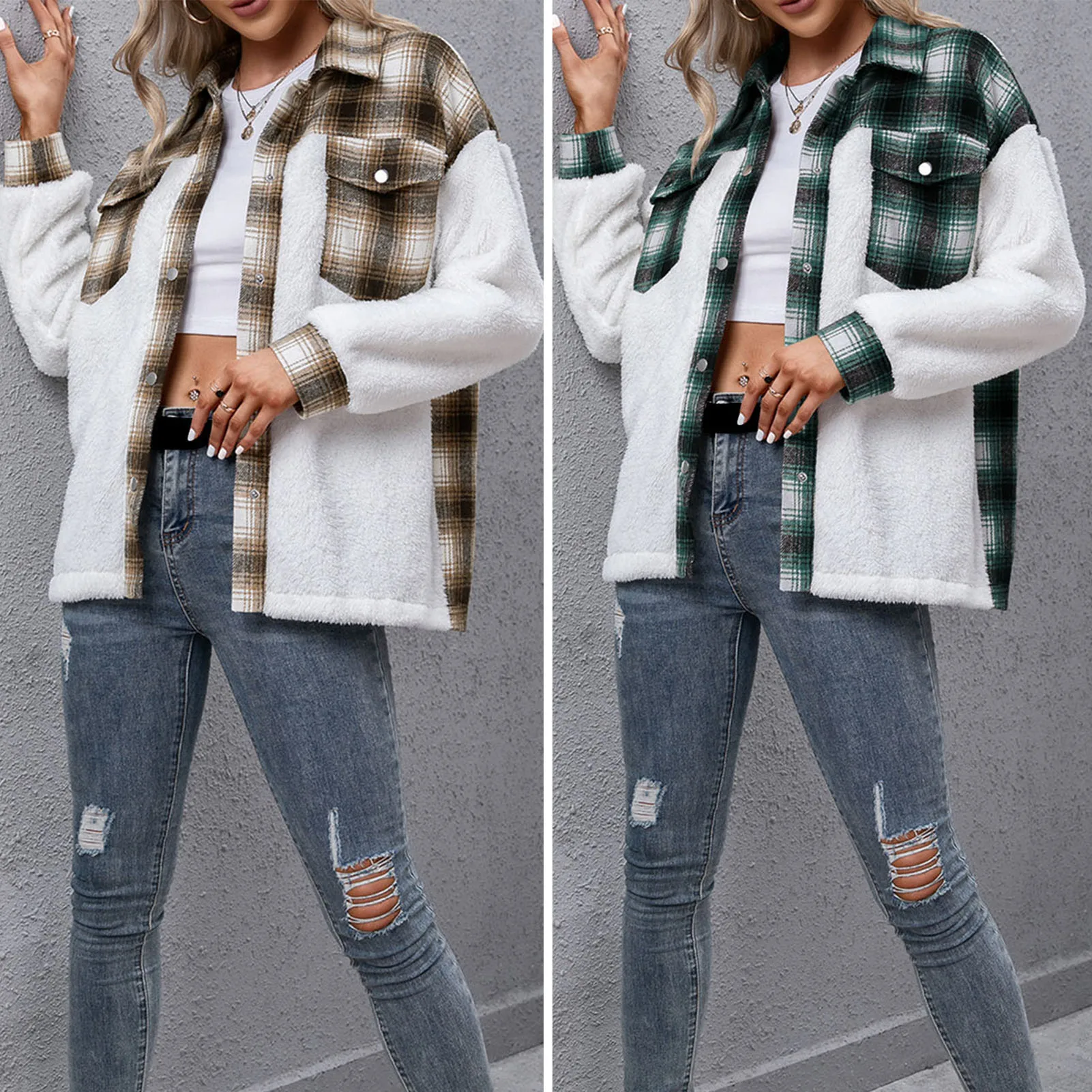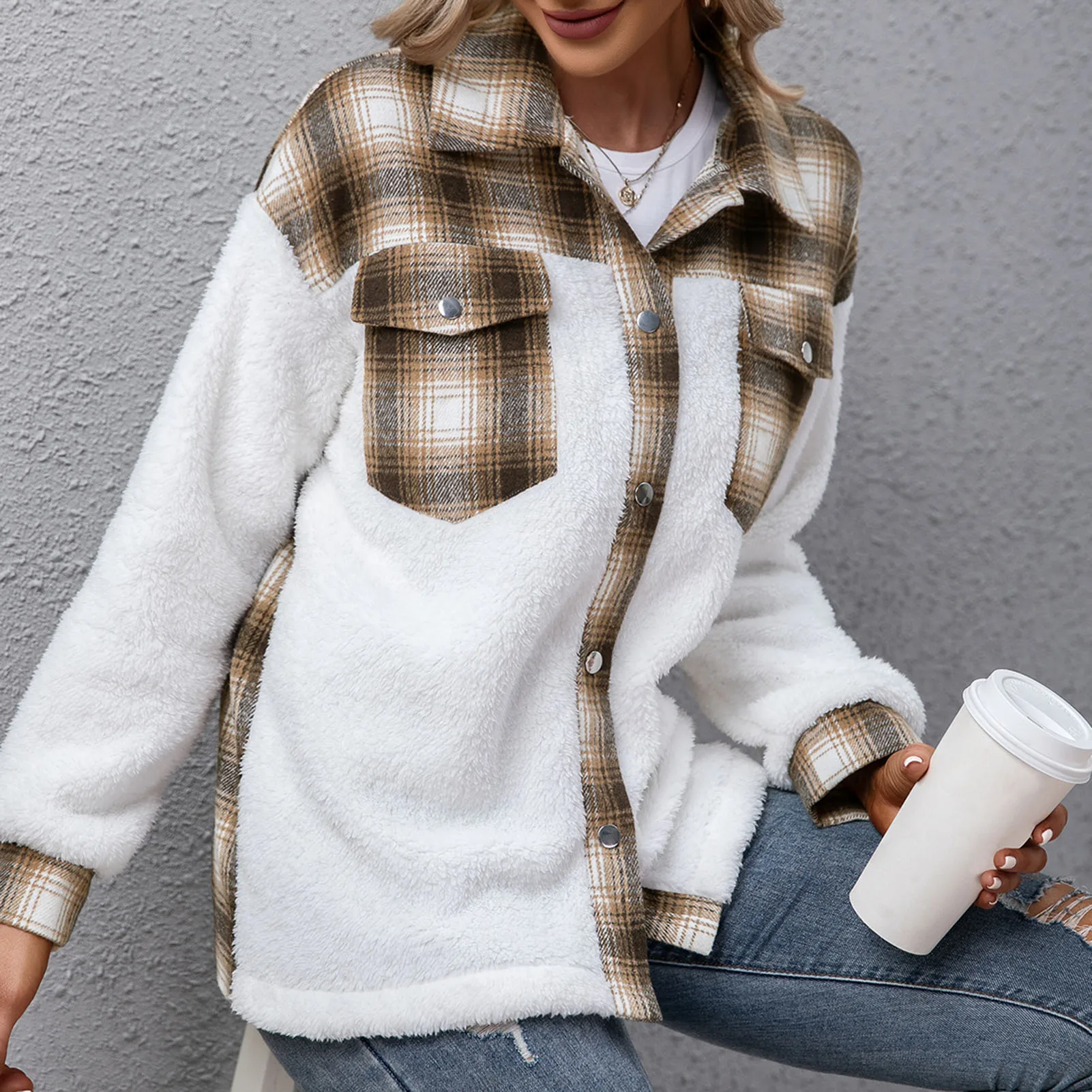 Loose winter jacket with plaid and fleece splicing design for streets. It has turn-down collar, press stud at the front, drop shoulder and long sleeves. The plaid pattern adds a chic and cool feeling. Have it to pair jeans for winter.