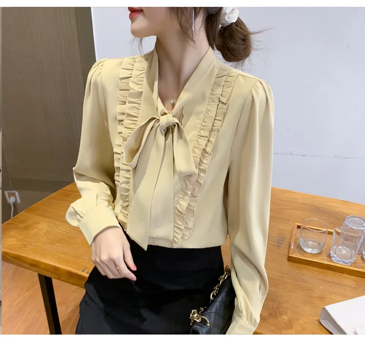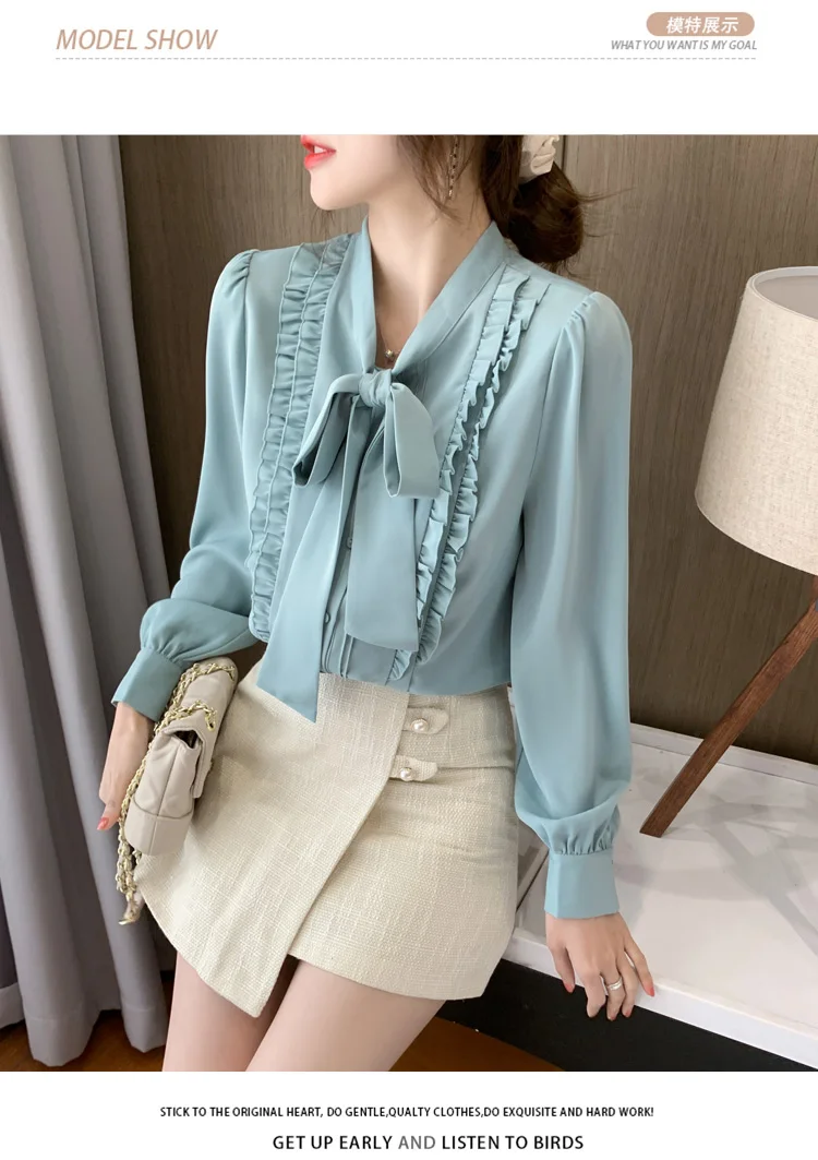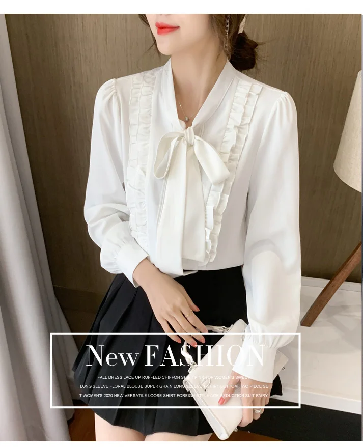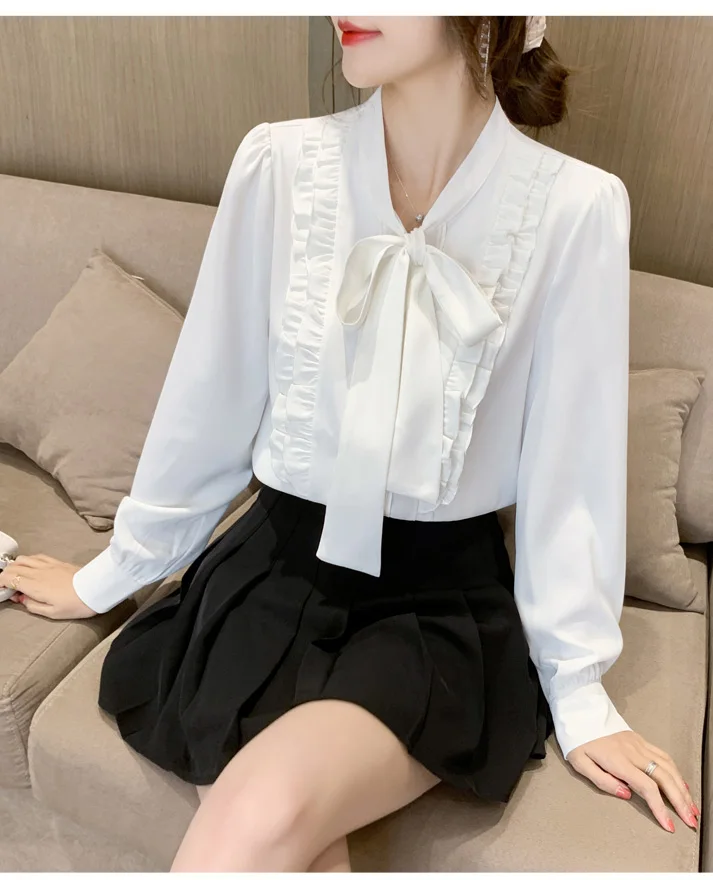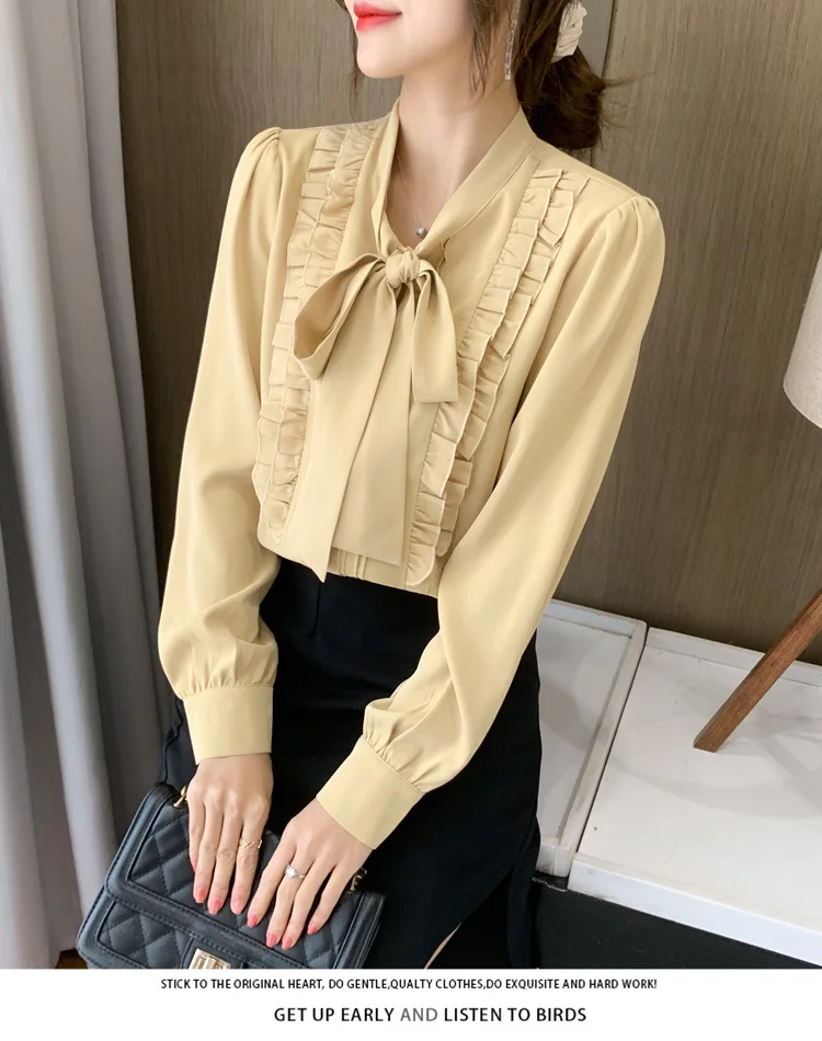Autumn New Long Sleeved Chiffon Shirt Fashion Casual Bow Ruffles Blouse Elegant Slim Office Lady Tops Clothing