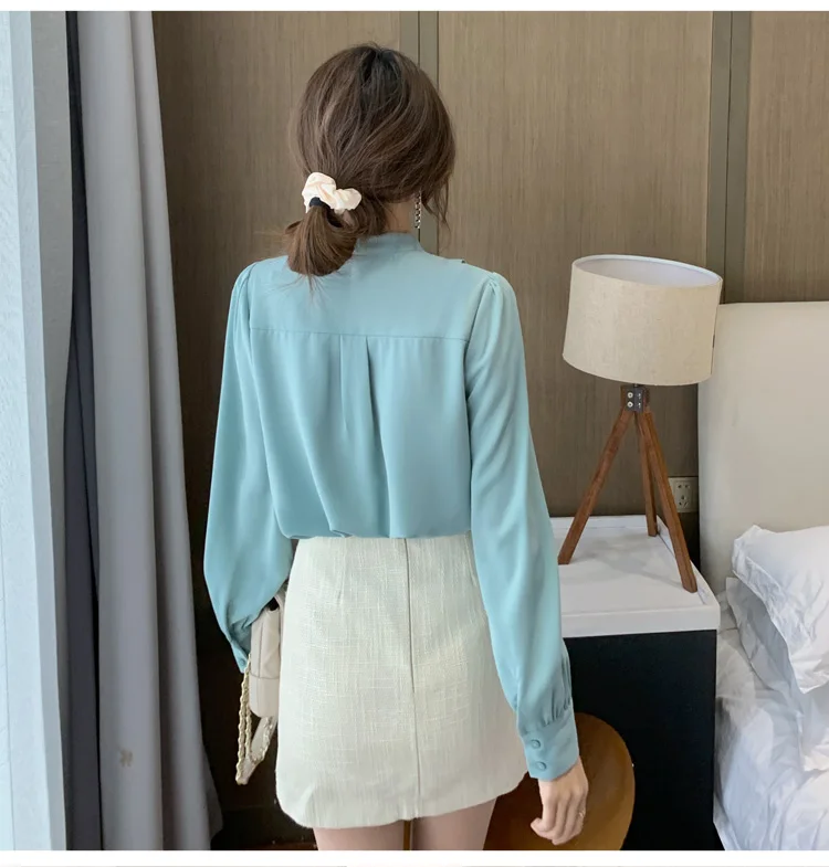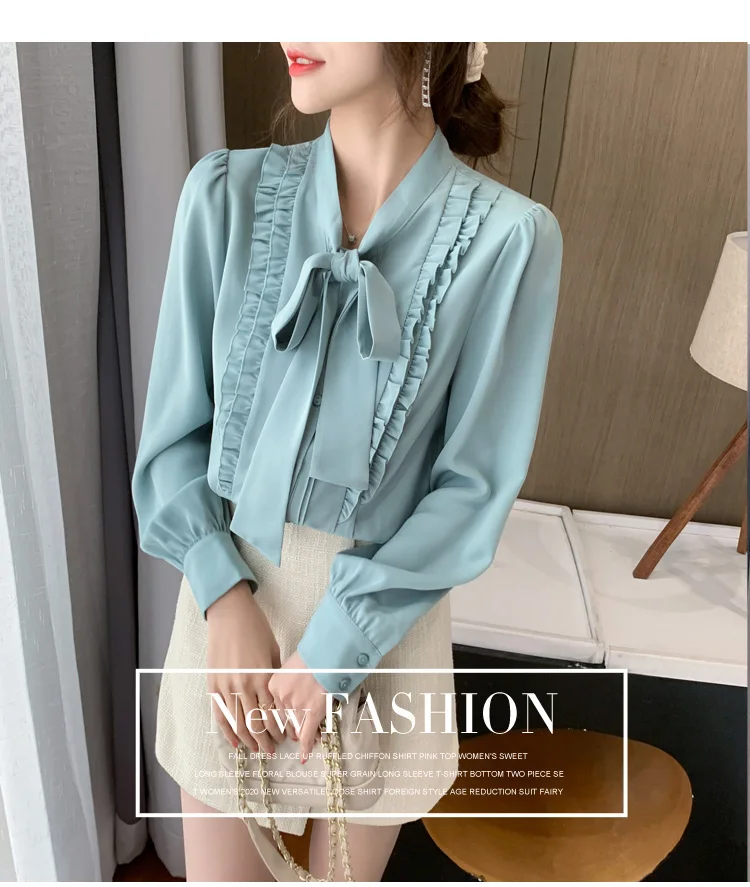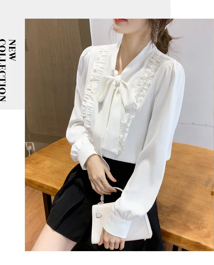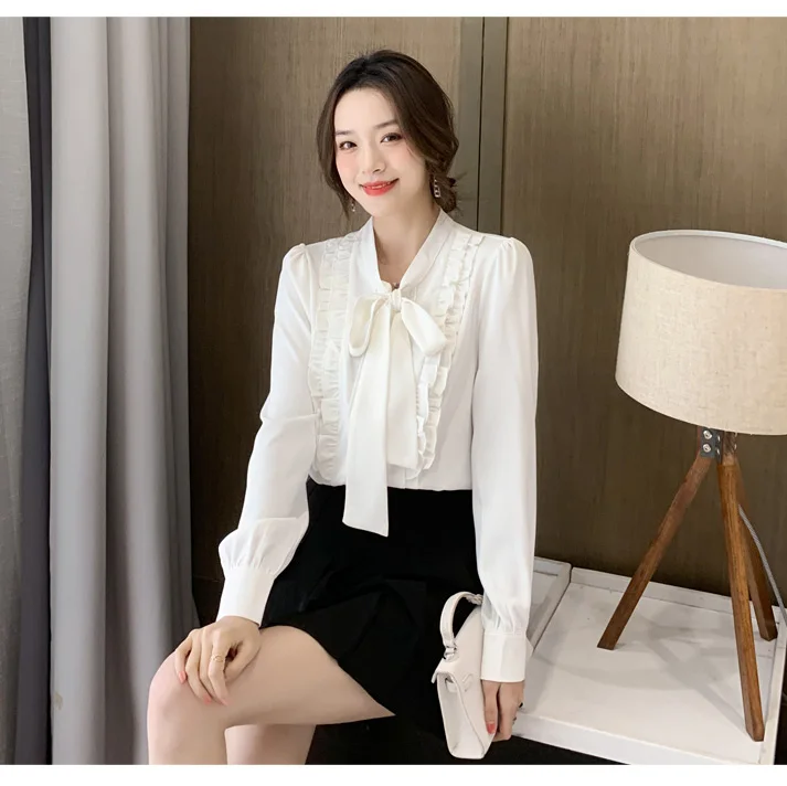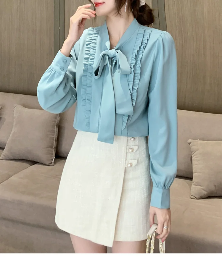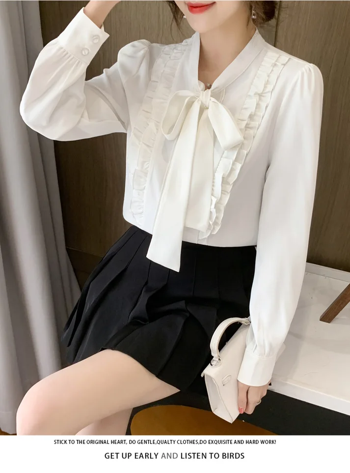 Autumn New Long Sleeved Chiffon Shirt Fashion Casual Bow Ruffles Blouse Elegant Slim Office Lady Tops Clothing
