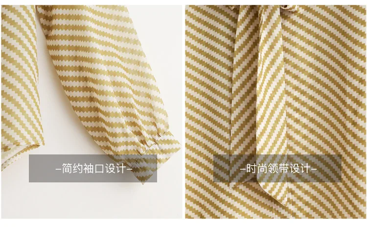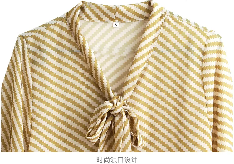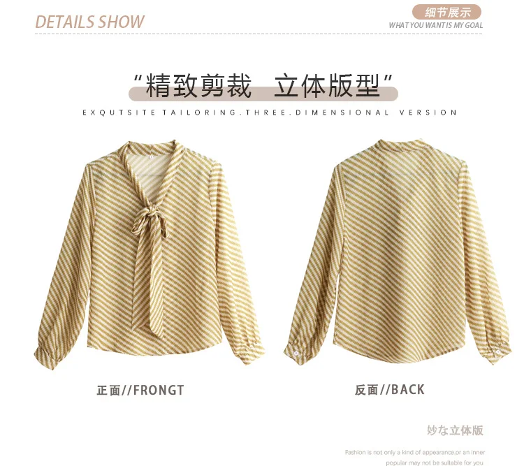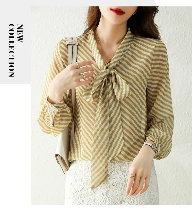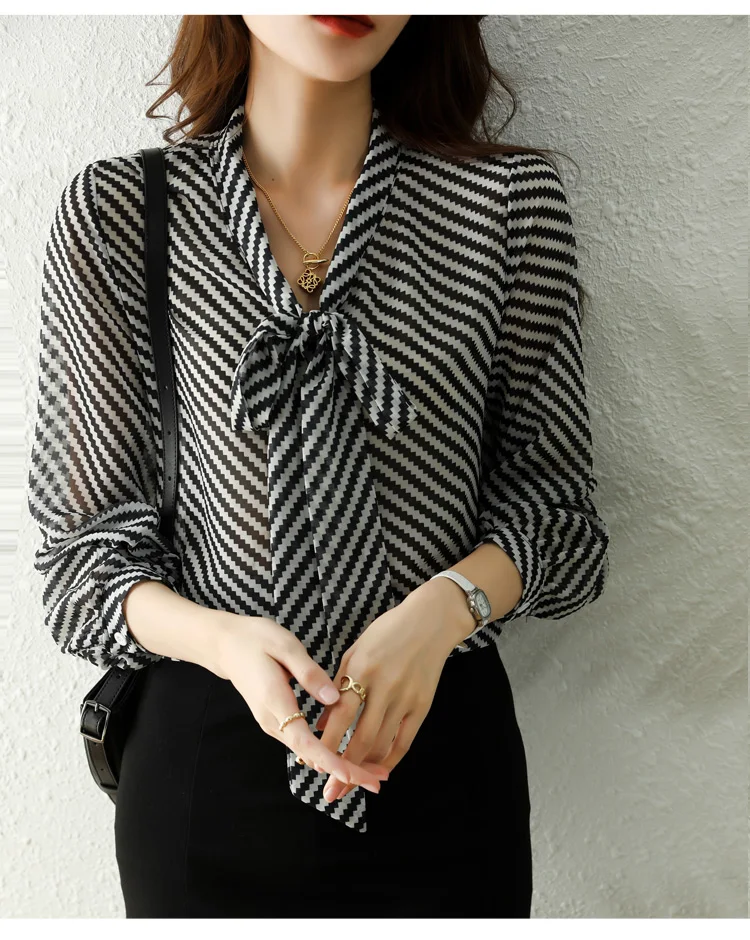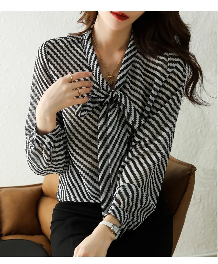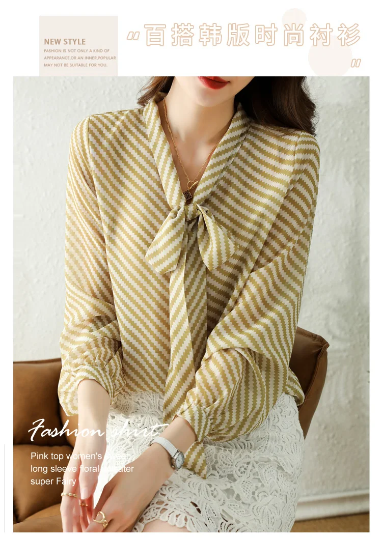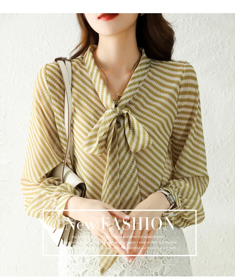 Autumn New Women Chiffon Blouse Fashion Casual High-End Long Sleeved Bow Striped Top Elegant Loose Office Lady Clothing