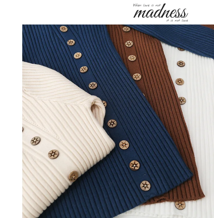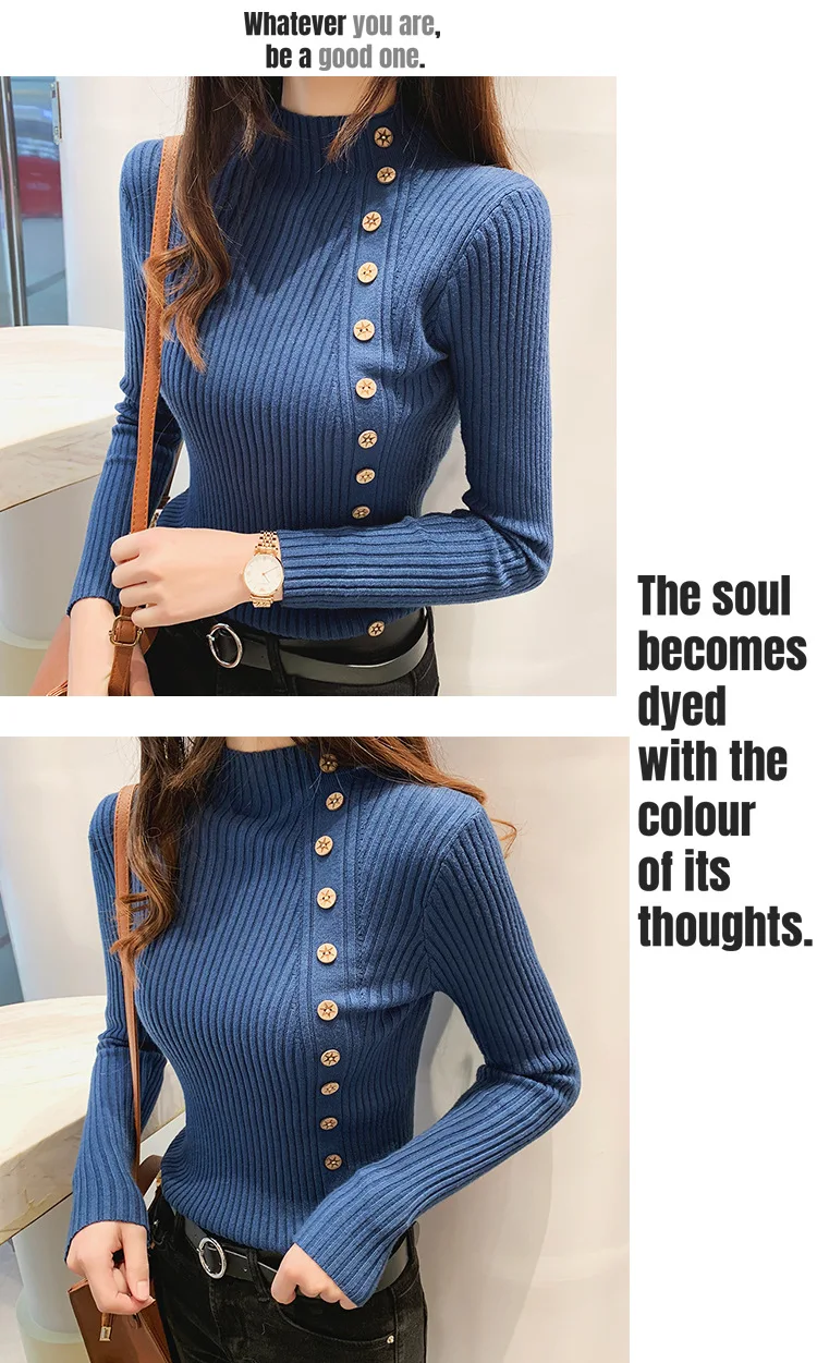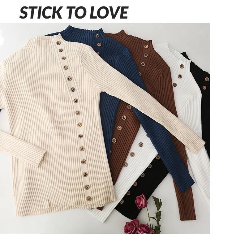 Autumn Ribbed Button Women Sweater Pullovers Cotton Long Sleeve Turtleneck Pullovers Jumpers Spring Soft Comfortable Basic Tops