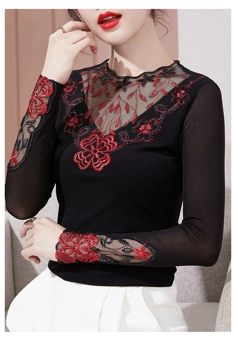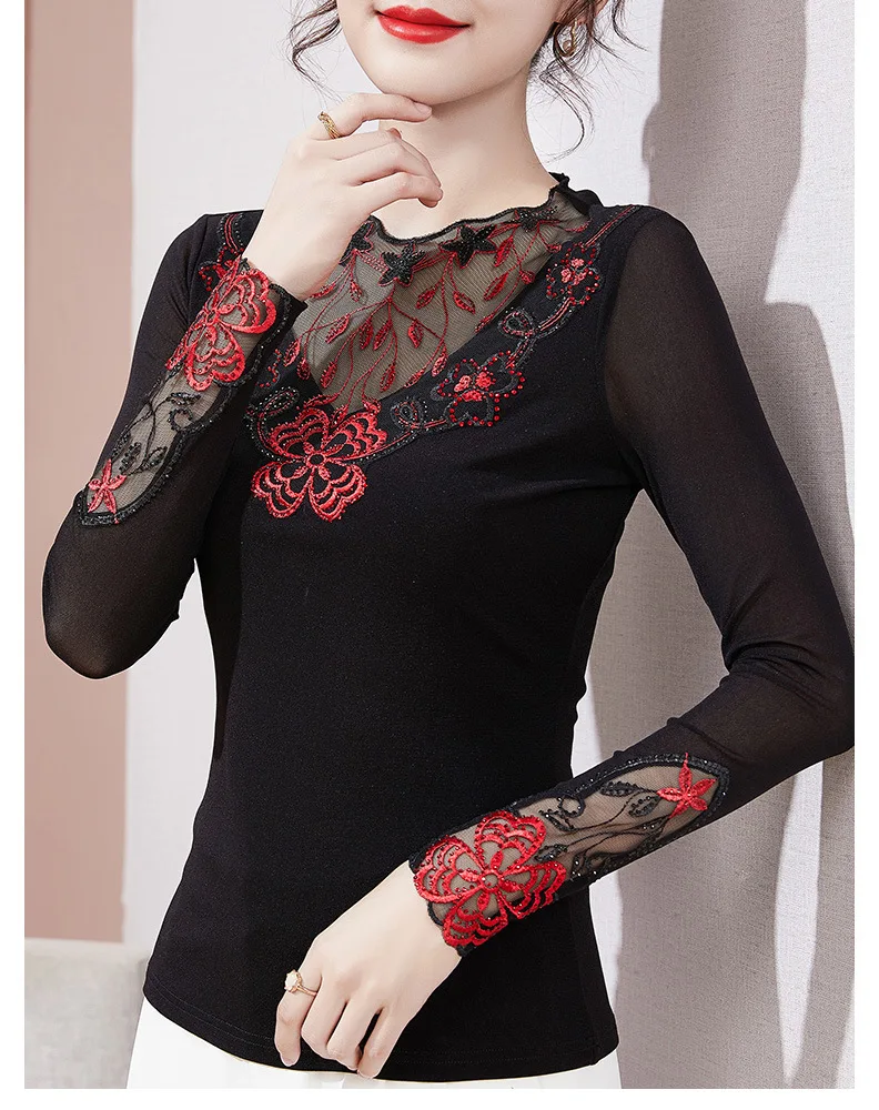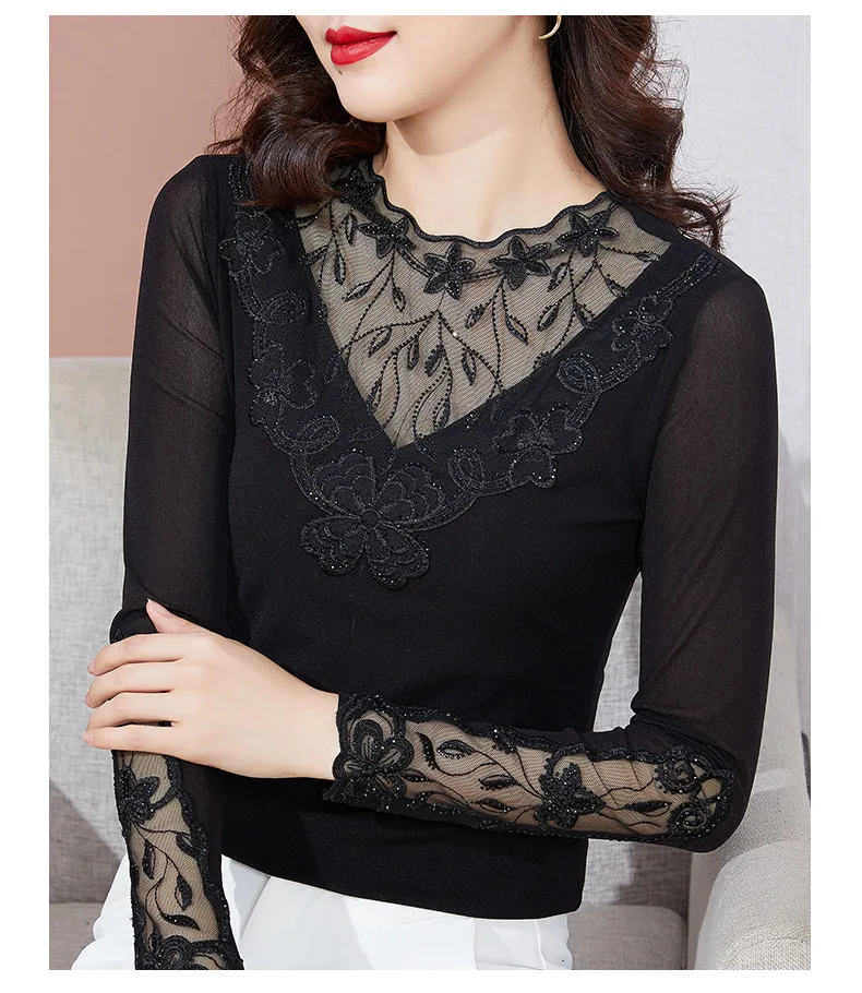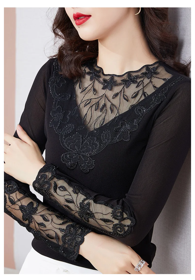 Autumn Winter Lace Tops Elegant Slim Embroidered Mesh Bottoming Shirt Fashion Sexy Hollow Out Hot Drilling Women's tshirt