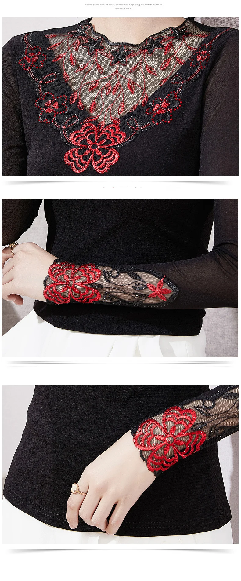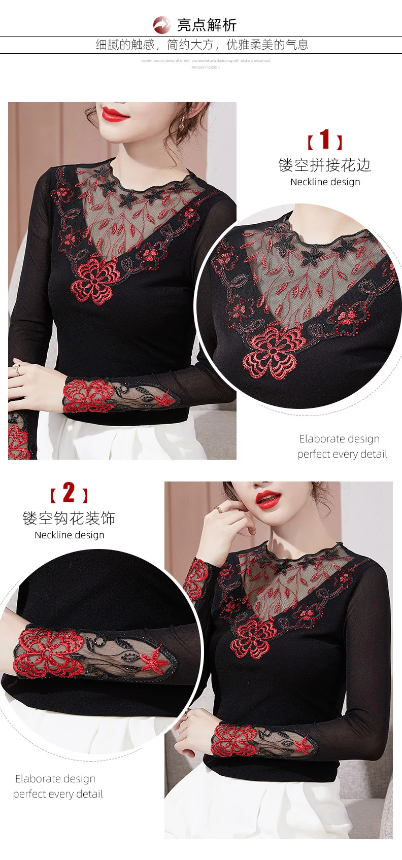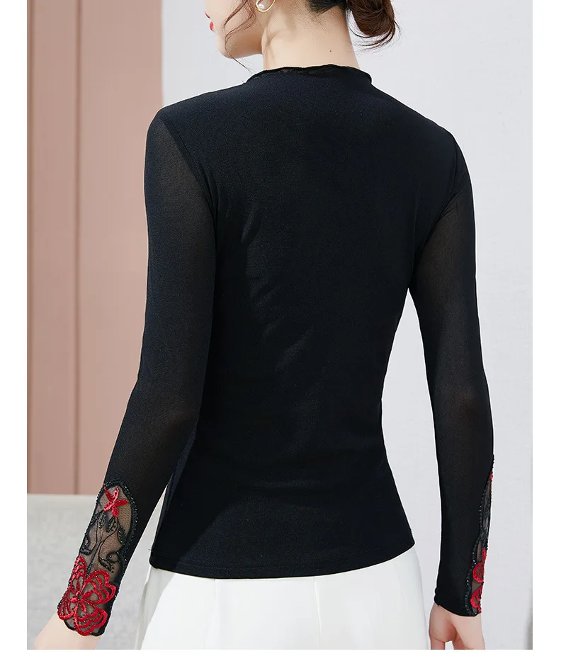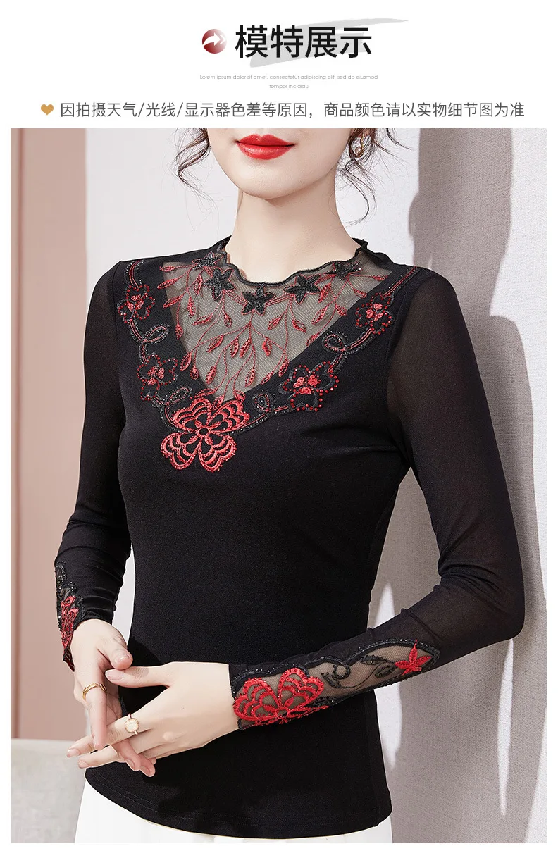 Autumn Winter Lace Tops Elegant Slim Embroidered Mesh Bottoming Shirt Fashion Sexy Hollow Out Hot Drilling Women's tshirt