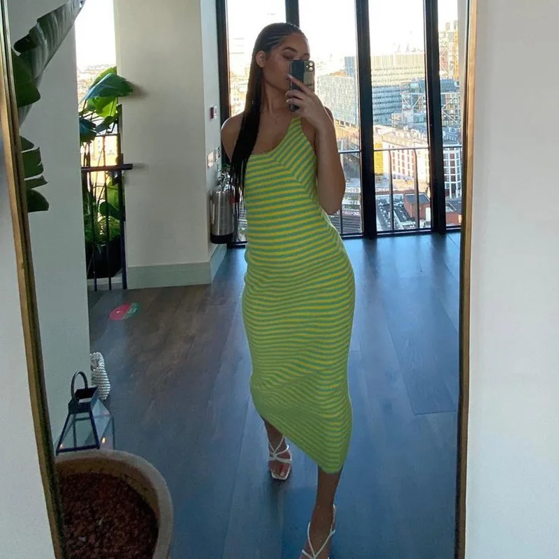 Vacation Sexy Backless Slit Striped Beach Long Dresses Women Elegant Off Shoulder Wrap Skinny Party Midi Dress 2021Summer Casual