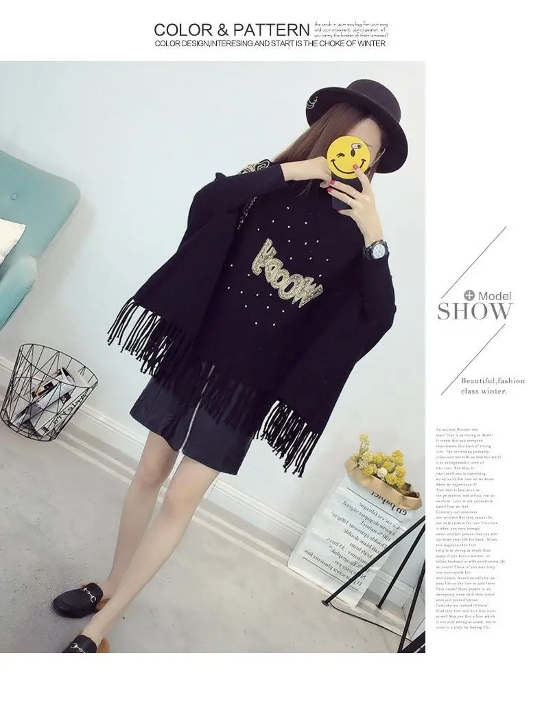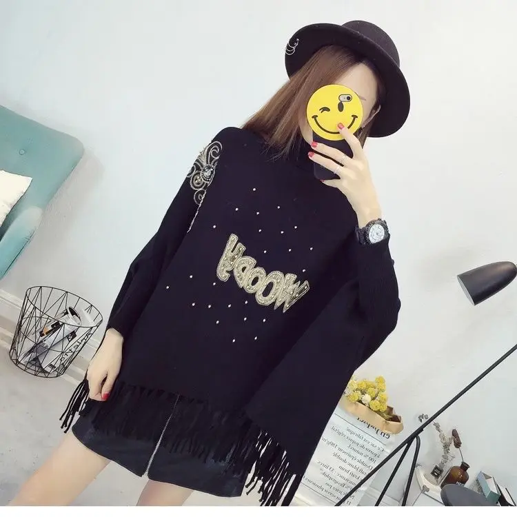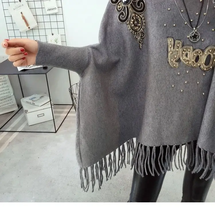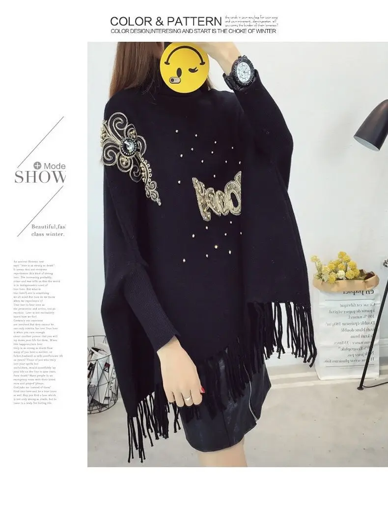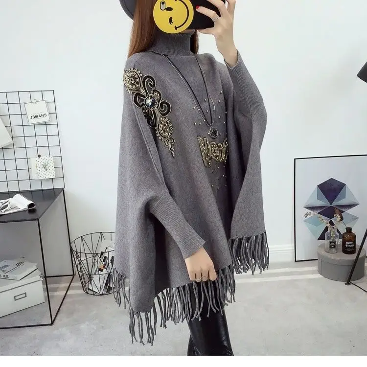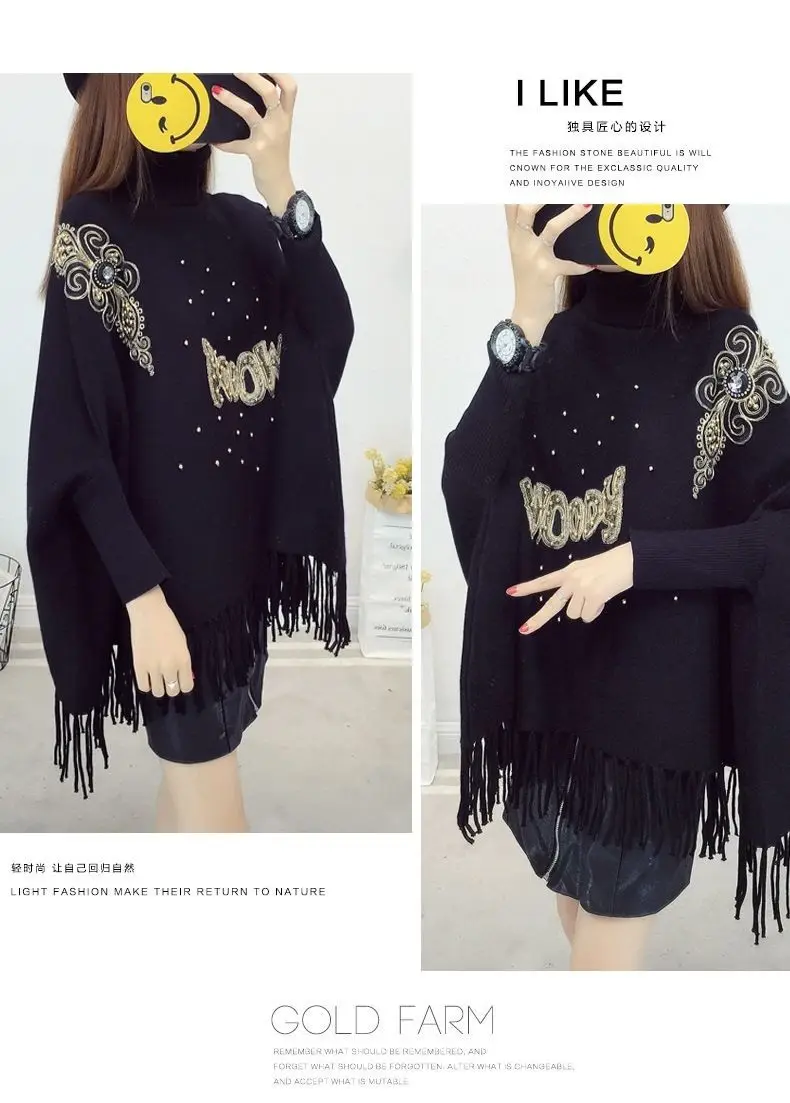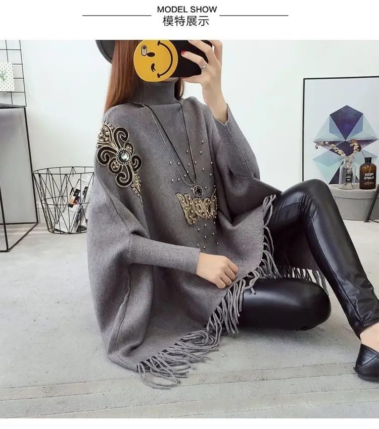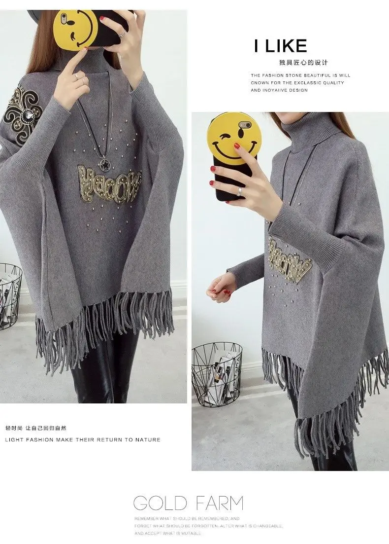 Winter high-neck lazy sweater women loose bat-sleeved jacket sweater cloak-style shawl tassel plus size autumn clothes tops